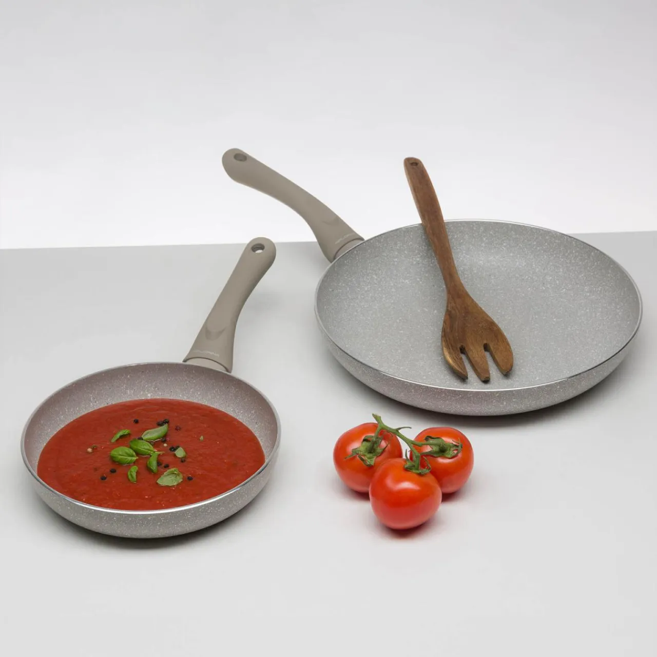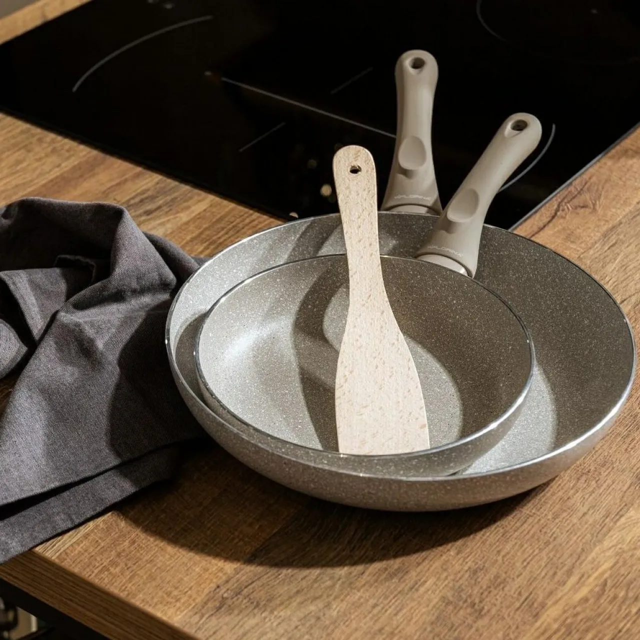 - Są wykonane z aluminium i pokryte powłoką nieprzywierającą typu granit. Przekłada się to na szybkie i równomierne nagrzewanie oraz trwałość.