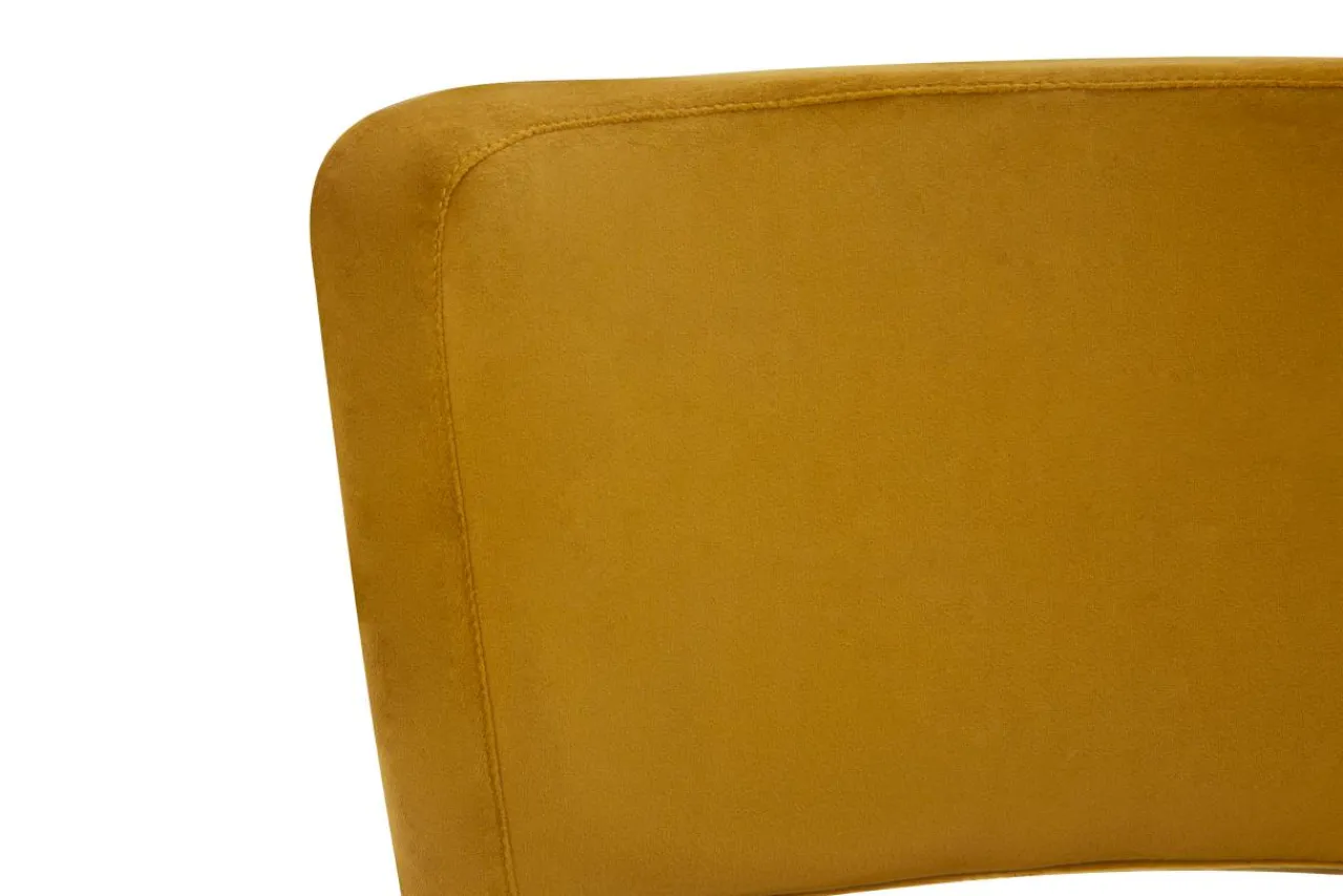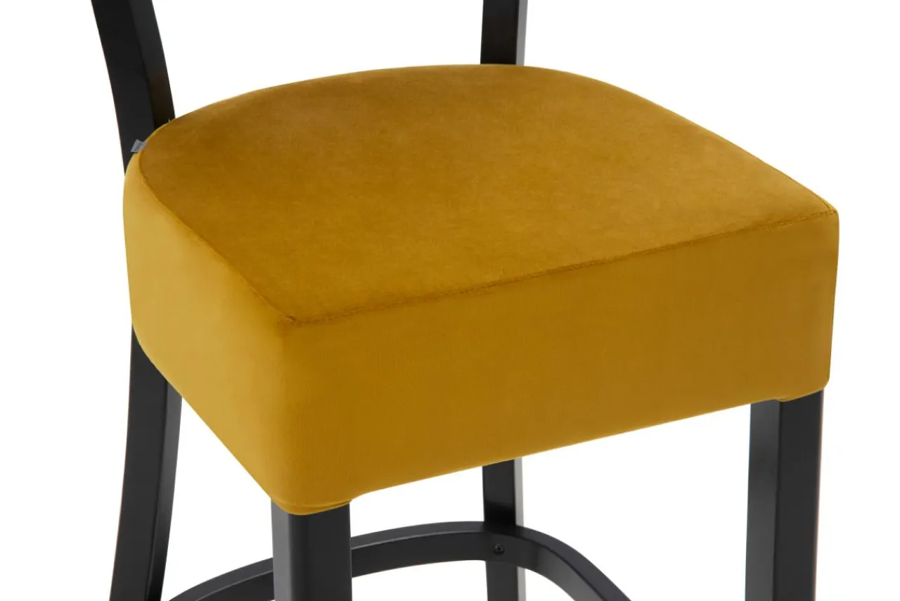 Krzesło barowe RYAN ma czarną podstawę, a siedzisko i oparcie pokryte tkaniną w kolorze musztardowym. To estetyczne połączenie kolorystyczne sprawi, że będzie przytulnie.