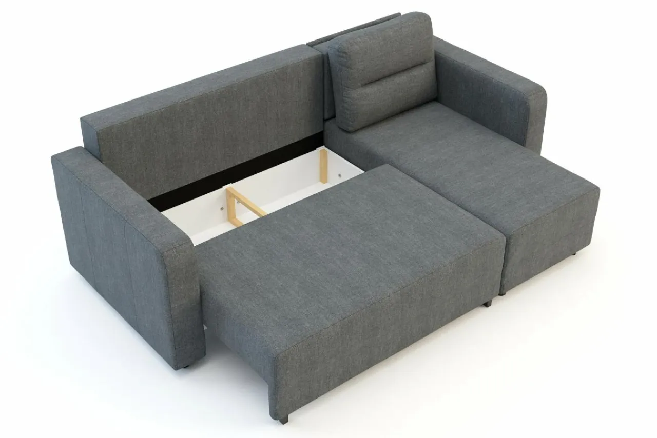 Narożnik posiada system rozkładania DL , dzięki temu rozłożysz go bez obaw o uszkodzenie podłogi. Wystarczy zdjąć poduchy, wysunąć siedzisko i złożyć zagłówek.