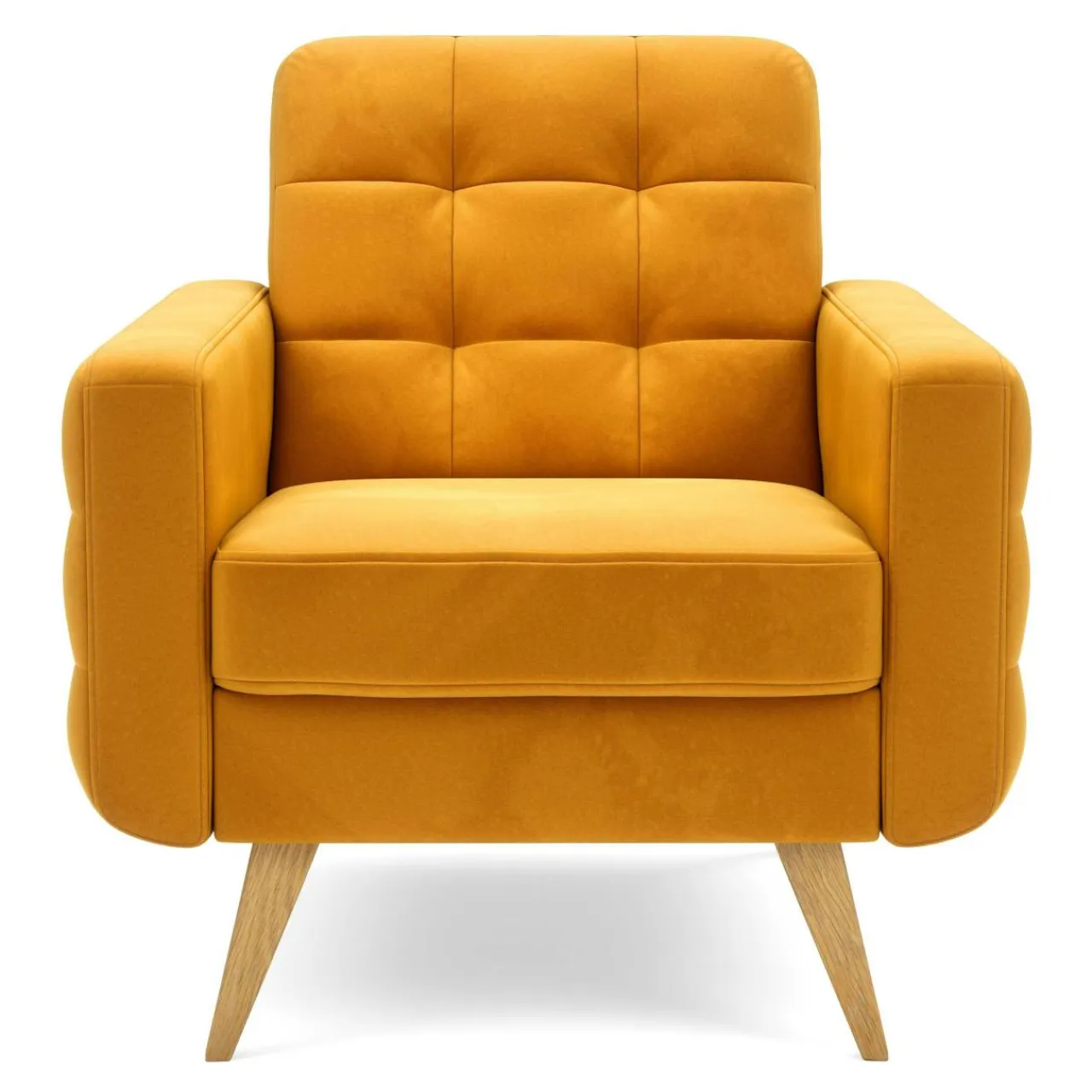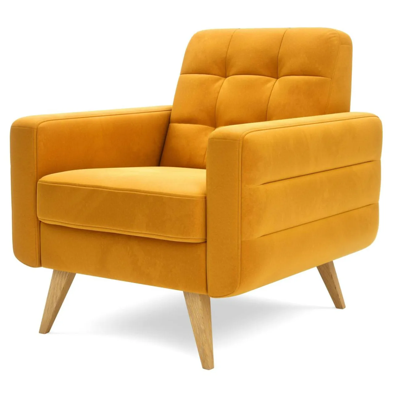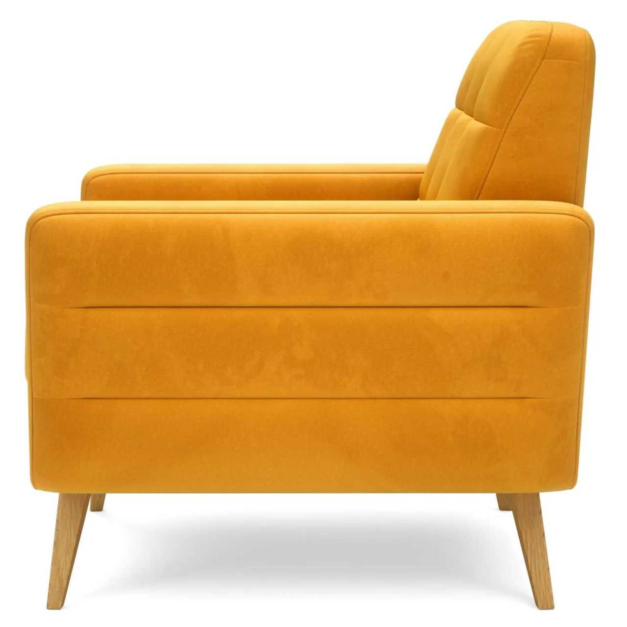 Urok fotela BODO tkwi w jego lekkiej bryle, w eleganckim pikowaniu i w aksamitnej strukturze musztardowej tkaniny, która lekko połyskując, nadaje wnętrzu wytwornego charakteru.