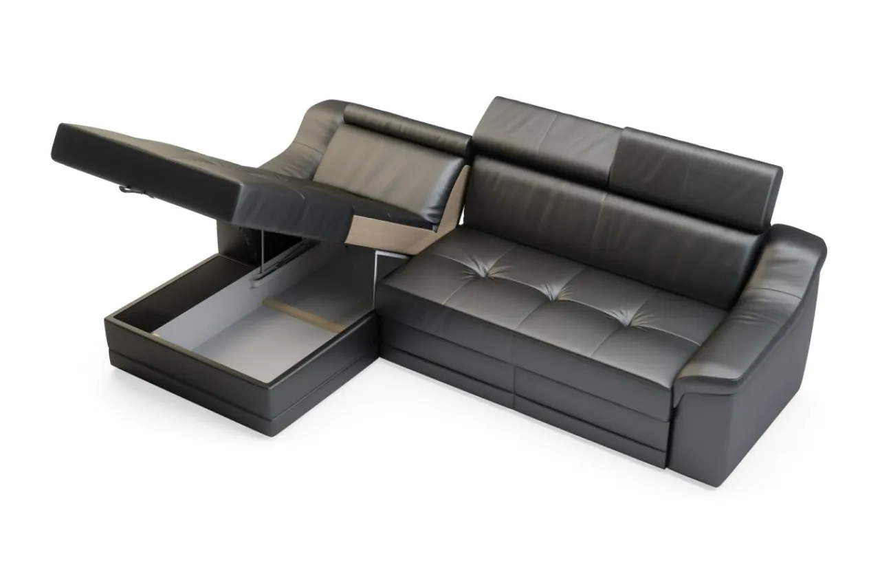 Komplet pościeli, koce i poduszki zmieścisz w pojemnym schowku, który znajduje się pod siedziskiem narożnika w otomanie.