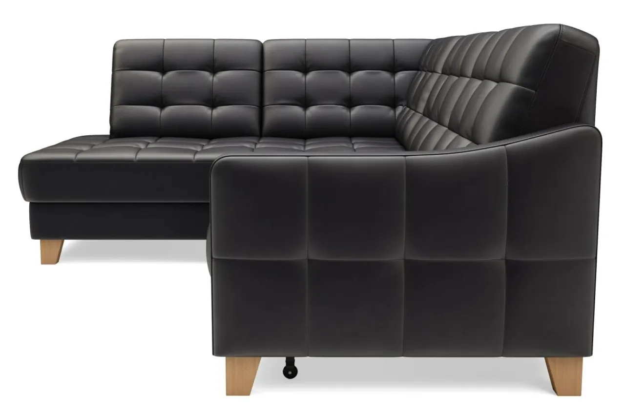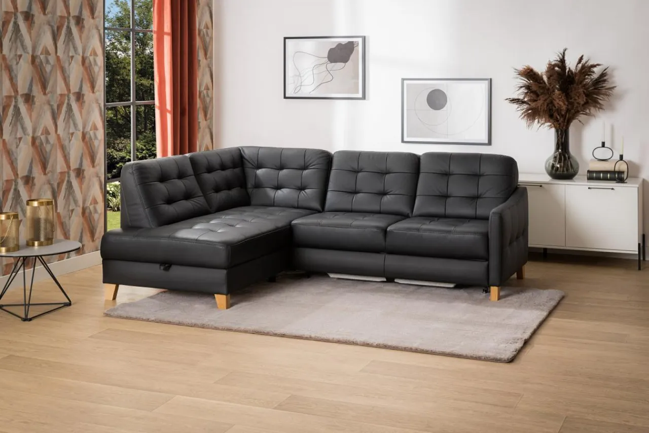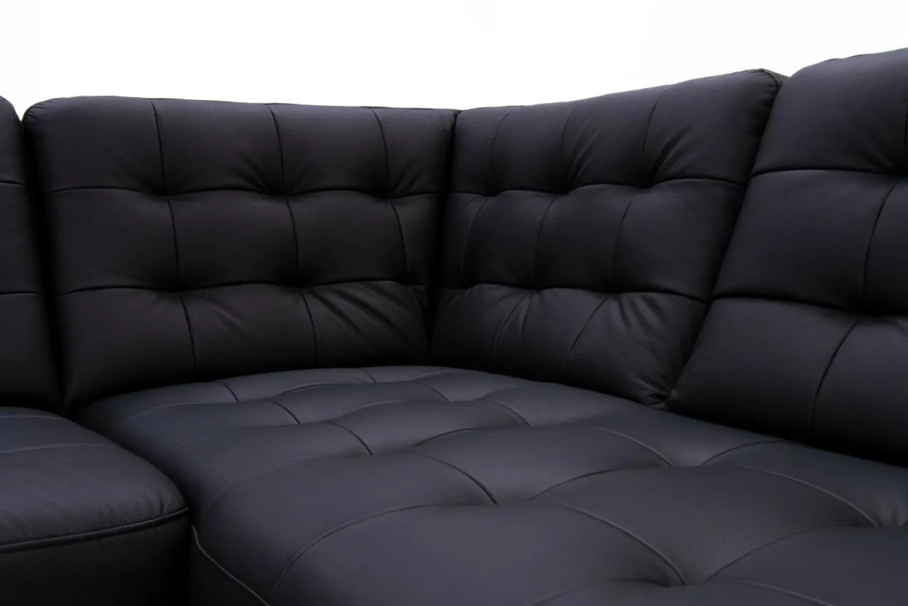 Mebel wypoczynkowy pokryty czarnymi skórami (naturalną i ekologiczną) może prezentować się lekko. Dowodem jest narożnik MALMO, którego urok tkwi w zgrabej bryle i pikowanej powierzchni skóry.