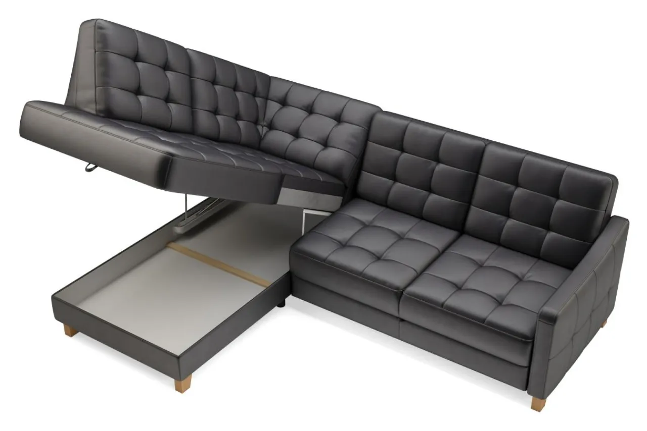 Narożnik można rozłożyć bez konieczności odsuwania go od ściany, dzięki łatwemu w obsłudze mechanizmowi – delfin.
