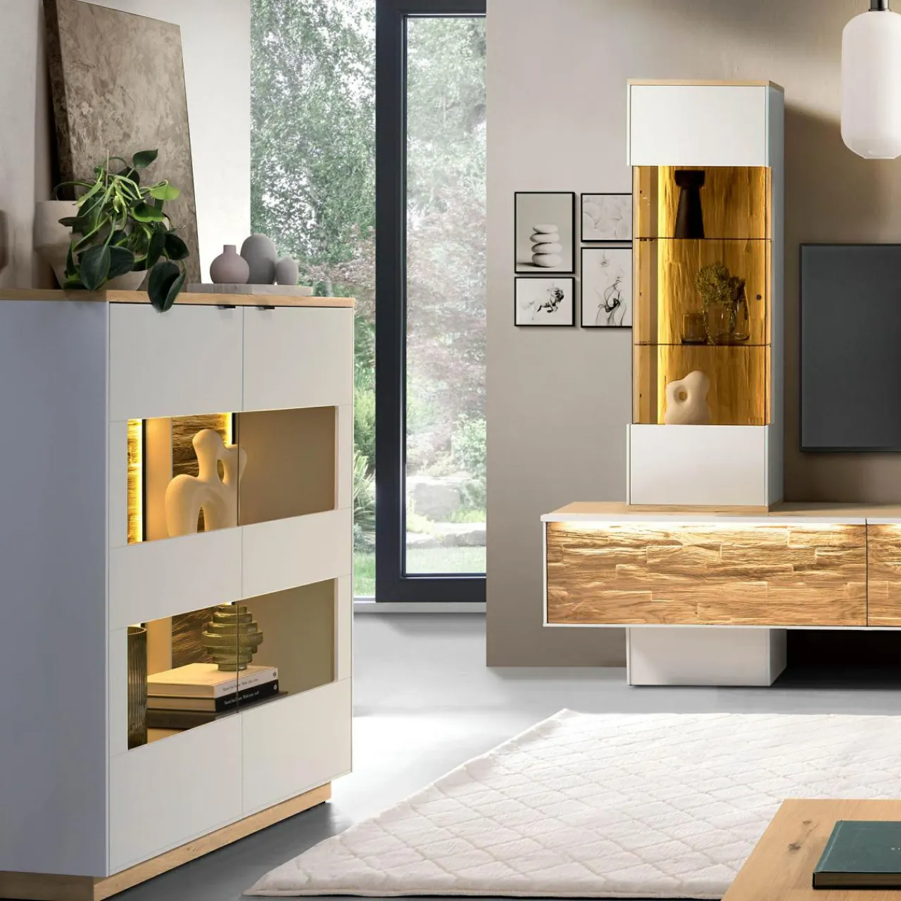 - Biel i dąb – duet idealny – minimalistyczne, białe korpusy kontrastują z organicznym wykończeniem, tworząc harmonijną kompozycję.