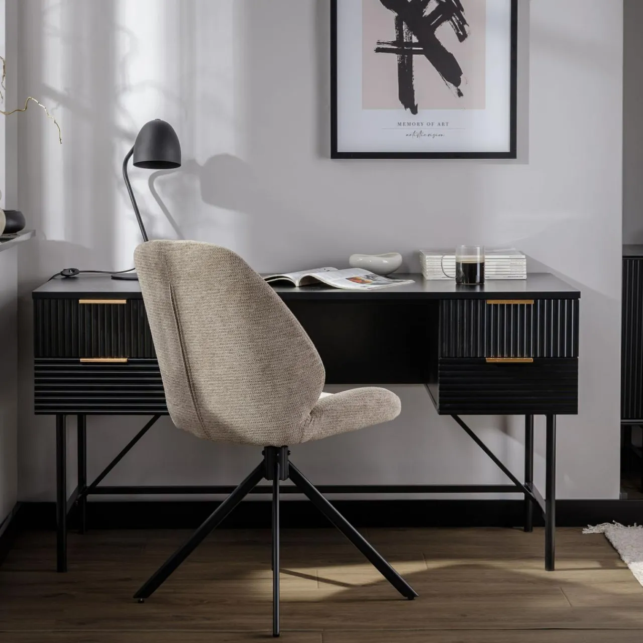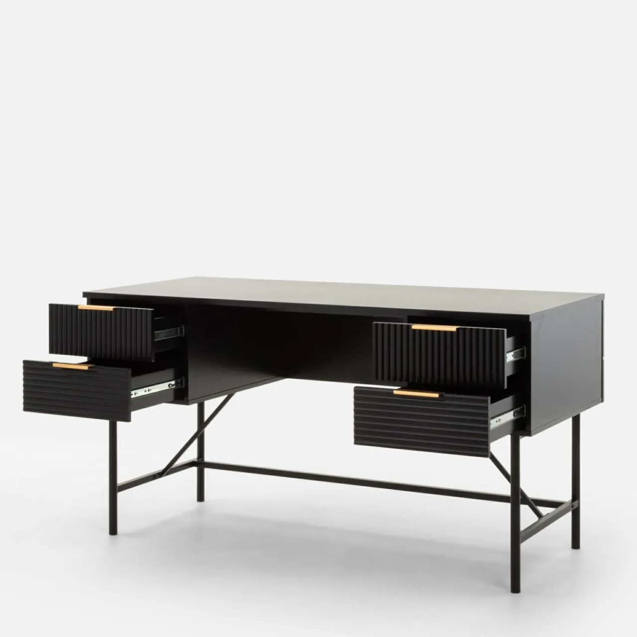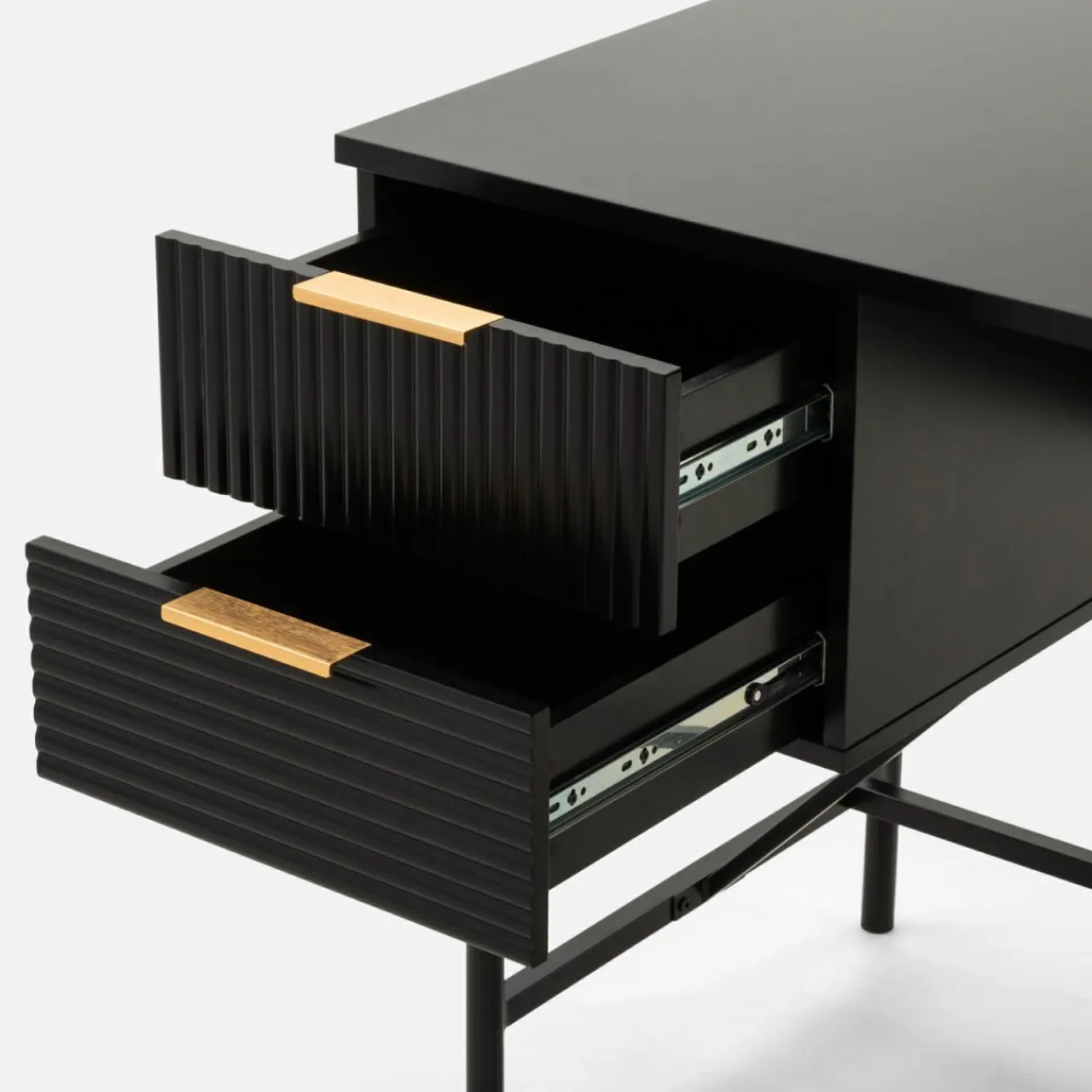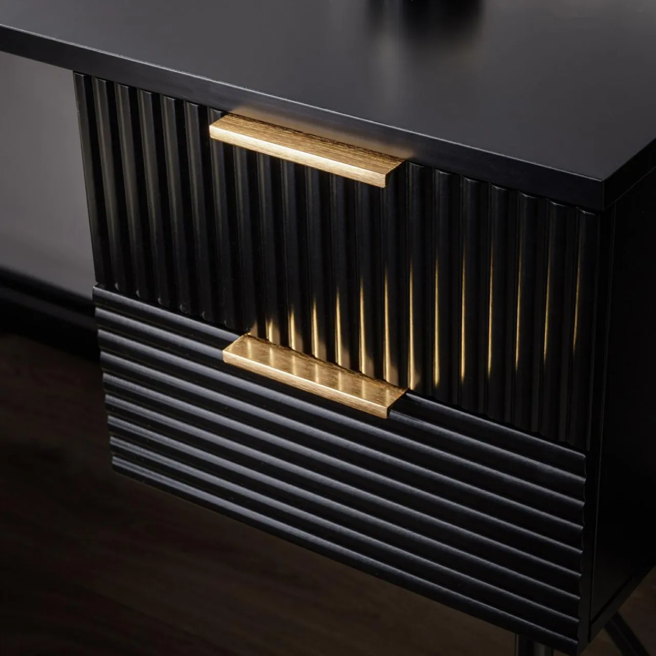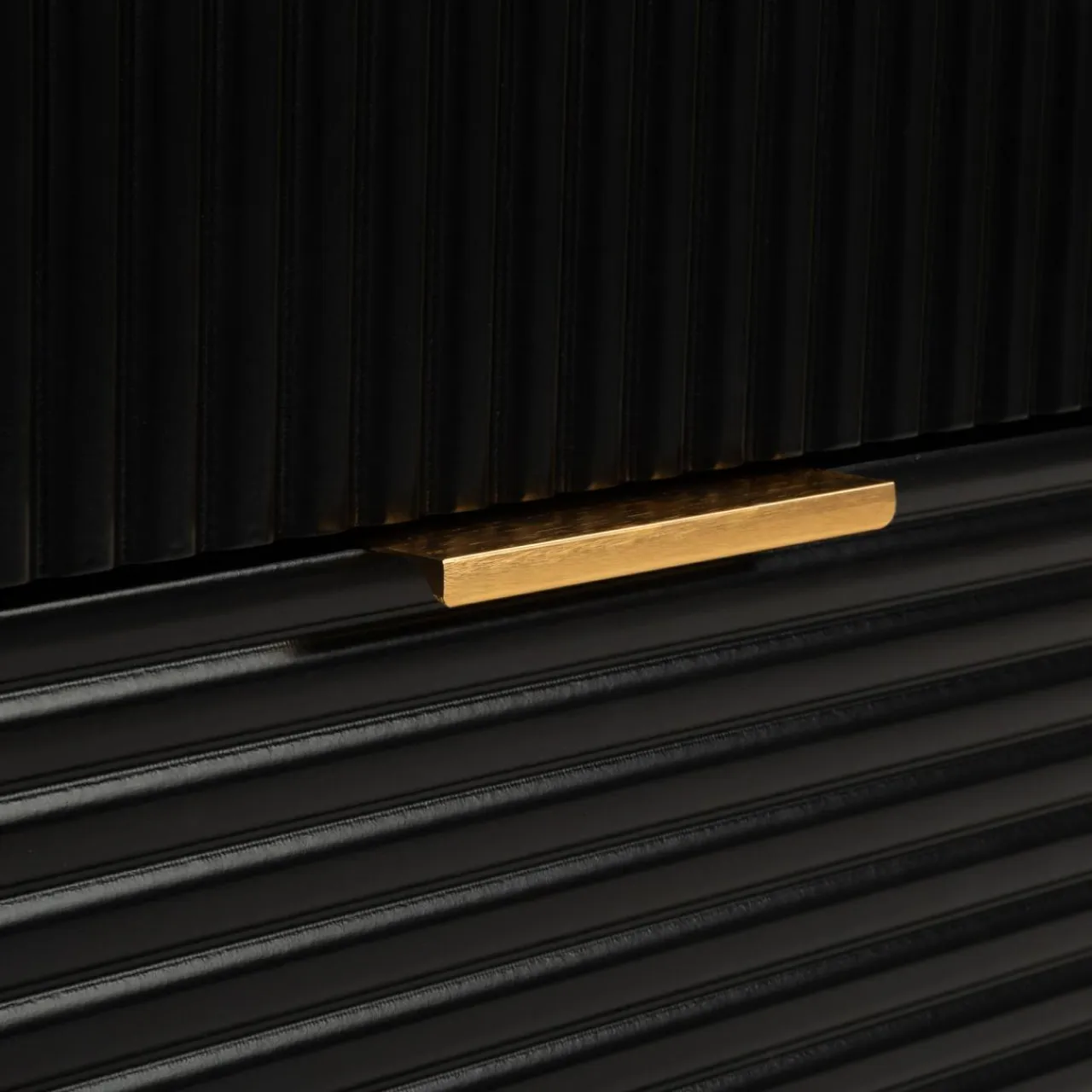 - Złote uchwyty dopełniają czarne geometryczne bryły mebli.