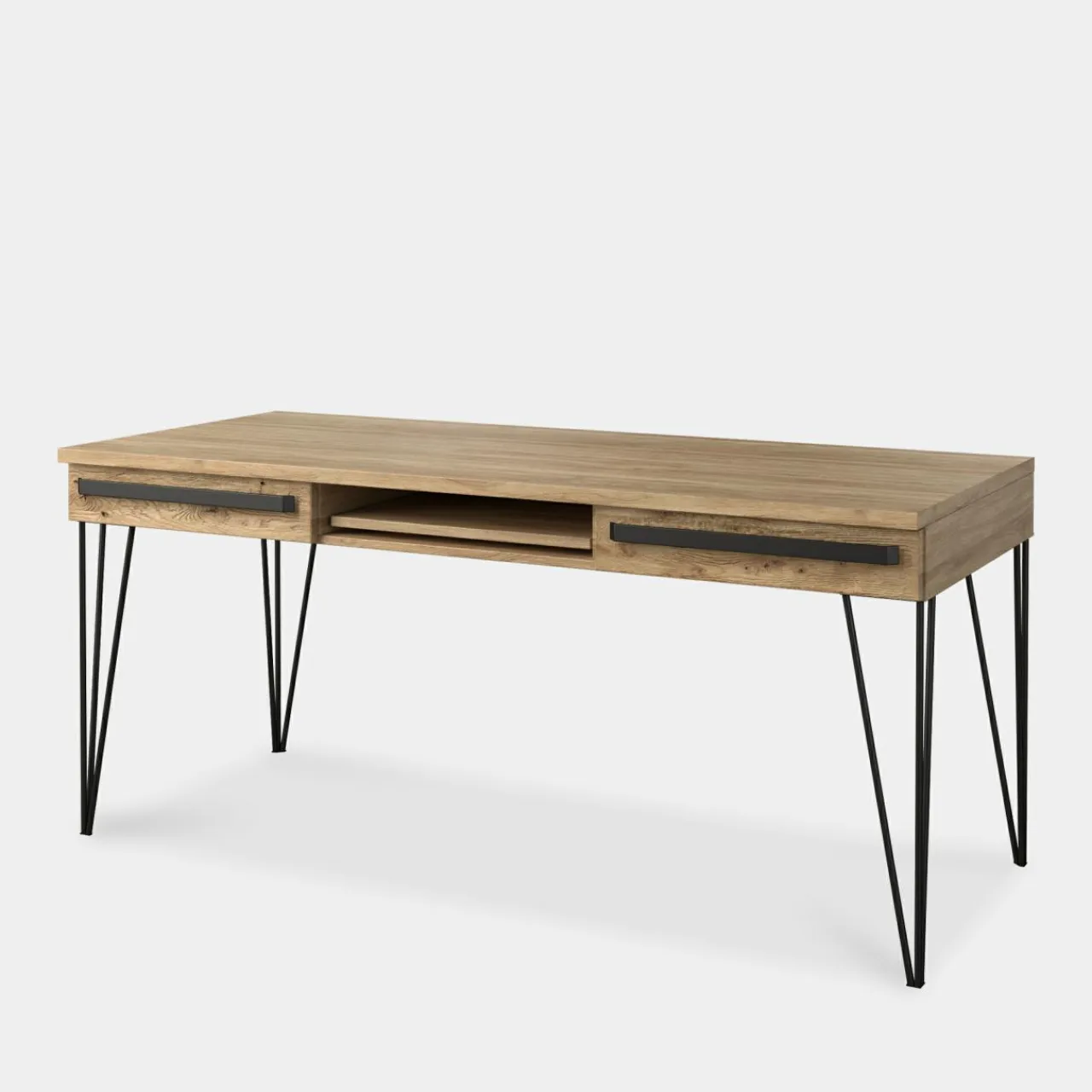 - W otwartej wnęce mieści się wysuwana półka schowaj w niej klawiaturę komputera, notatnik lub inne mniejsze przedmioty. Po skończonych obowiązkach wystarczy, że wsuniesz półkę do wnętrza mebla.