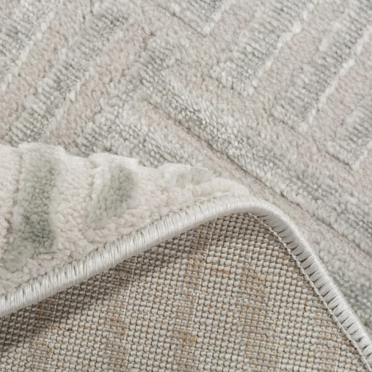Dywan dzięki połączeniu długiego i krótkiego włosia tworzy nietuzinkowy efekt 3D mieniący się odcieniami srebra i szarości.