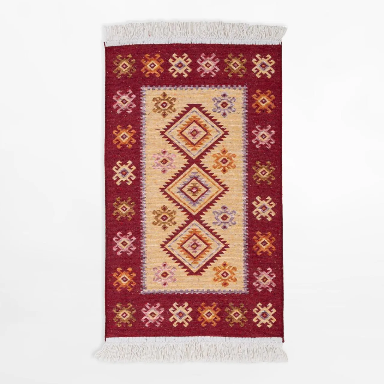 - Bordowy kolor wiedzie tu prym. W połączeniu z odcieniami beżu i brązu dywanik tworzy spójną całość.