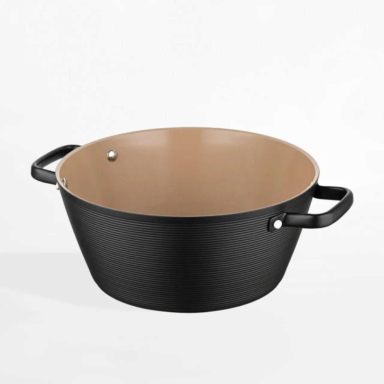 - Czarna powierzchnia zewnętrzna garnka pokryta prążkami ciekawie kontrastuje z gładkim wnętrzem w szampańskim kolorze. Połączenie tych dwóch barw wprowadzi powiew wytworności do każdej kuchni, niezależnie od jej stylu.