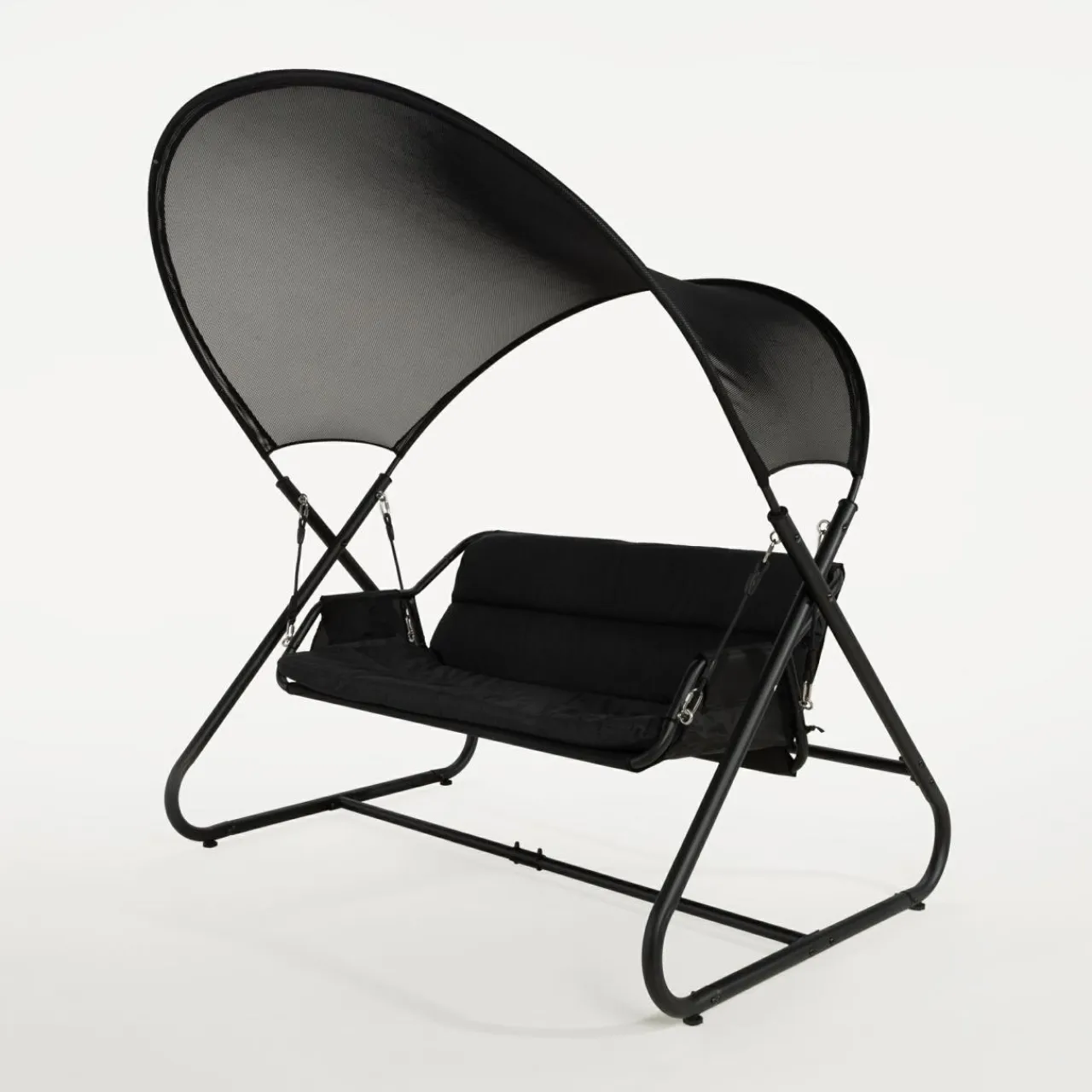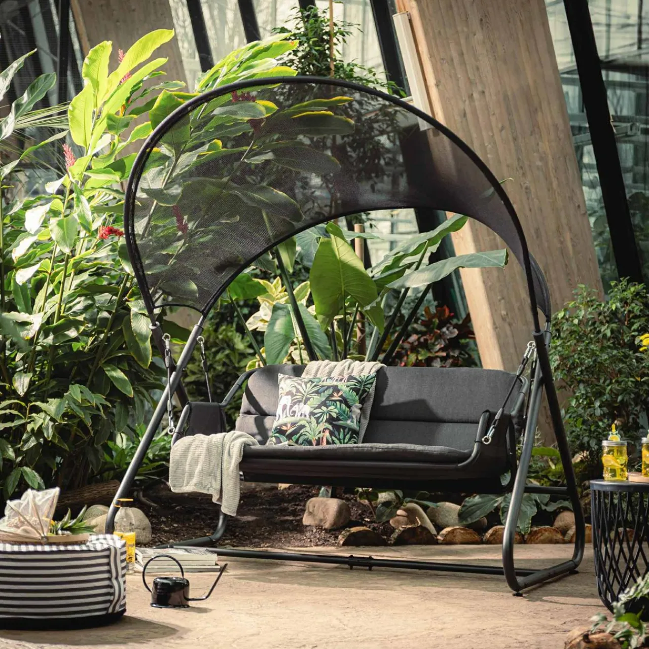 - Duży dach z siatki mesh tworzy delikatną ochronę przed słońcem.