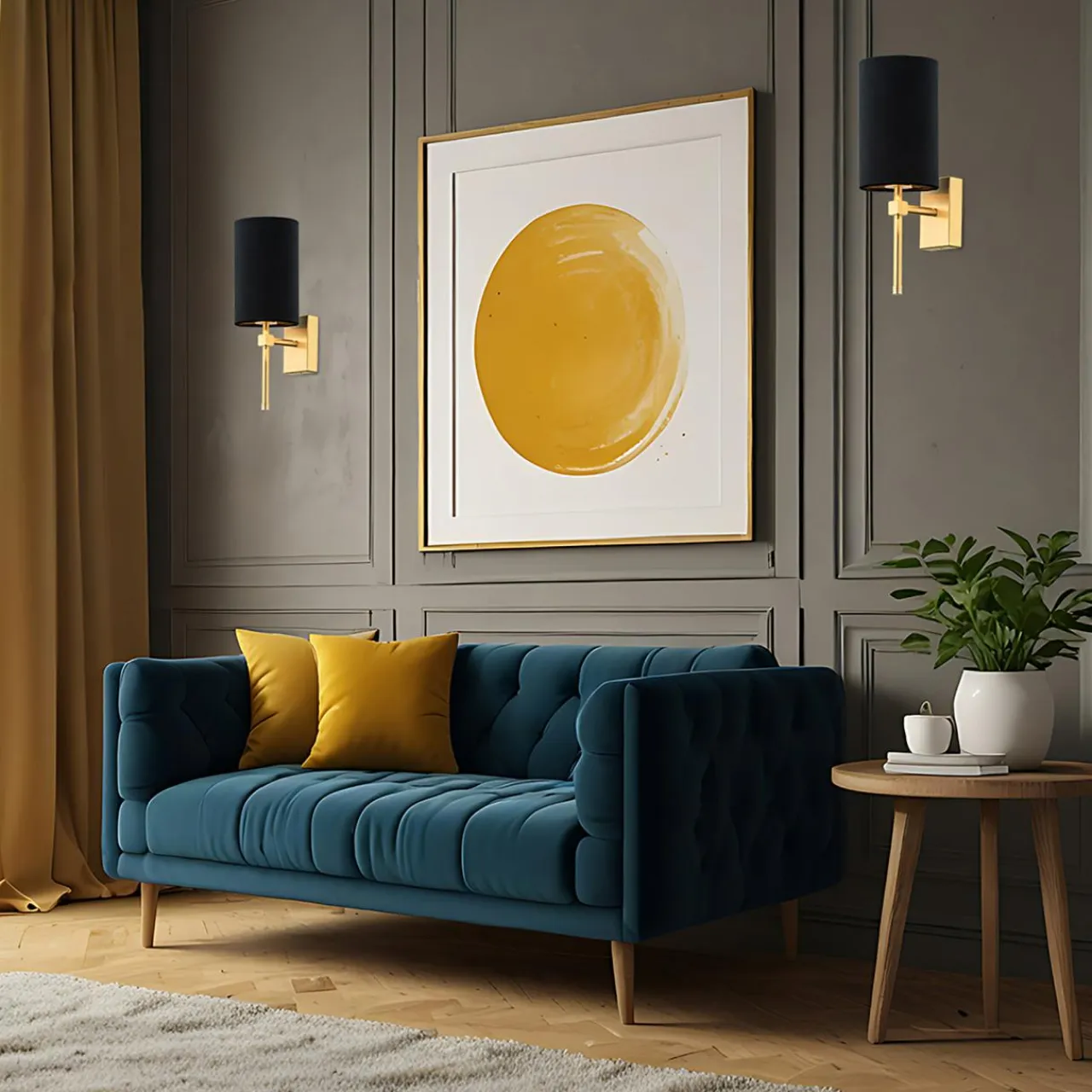 - Abażur z tkaniny ma gładką welurową powierzchnię, która została zestawiona ze złotym, szczotkowanym wykończeniem podstawy – przyciąga uwagę i rozjaśnia optycznie wnętrze.