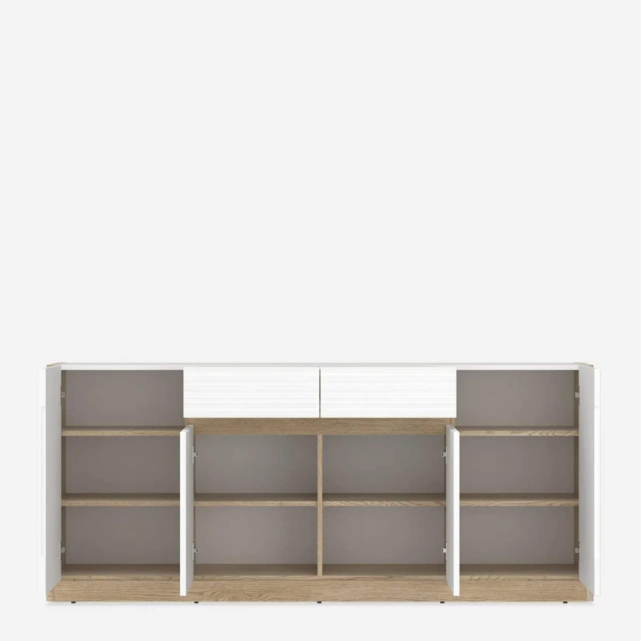 Komoda 4-drzwiowa CALIMA to rozwiązanie dla większych przestrzeni. Jej szerokość wynosząca 185,6 cm sprawia, że jest idealna do przestronnych salonów, sypialni czy jadalni, zwłaszcza tych w jasnych, nowoczesnych tonacjach.
