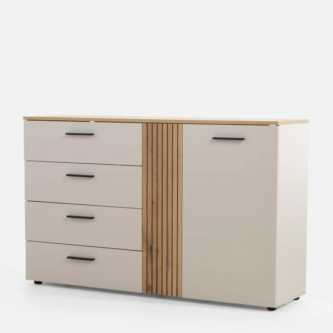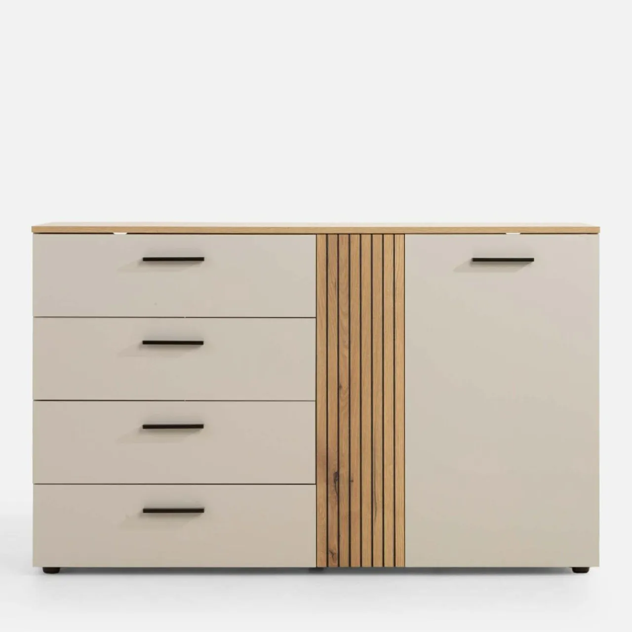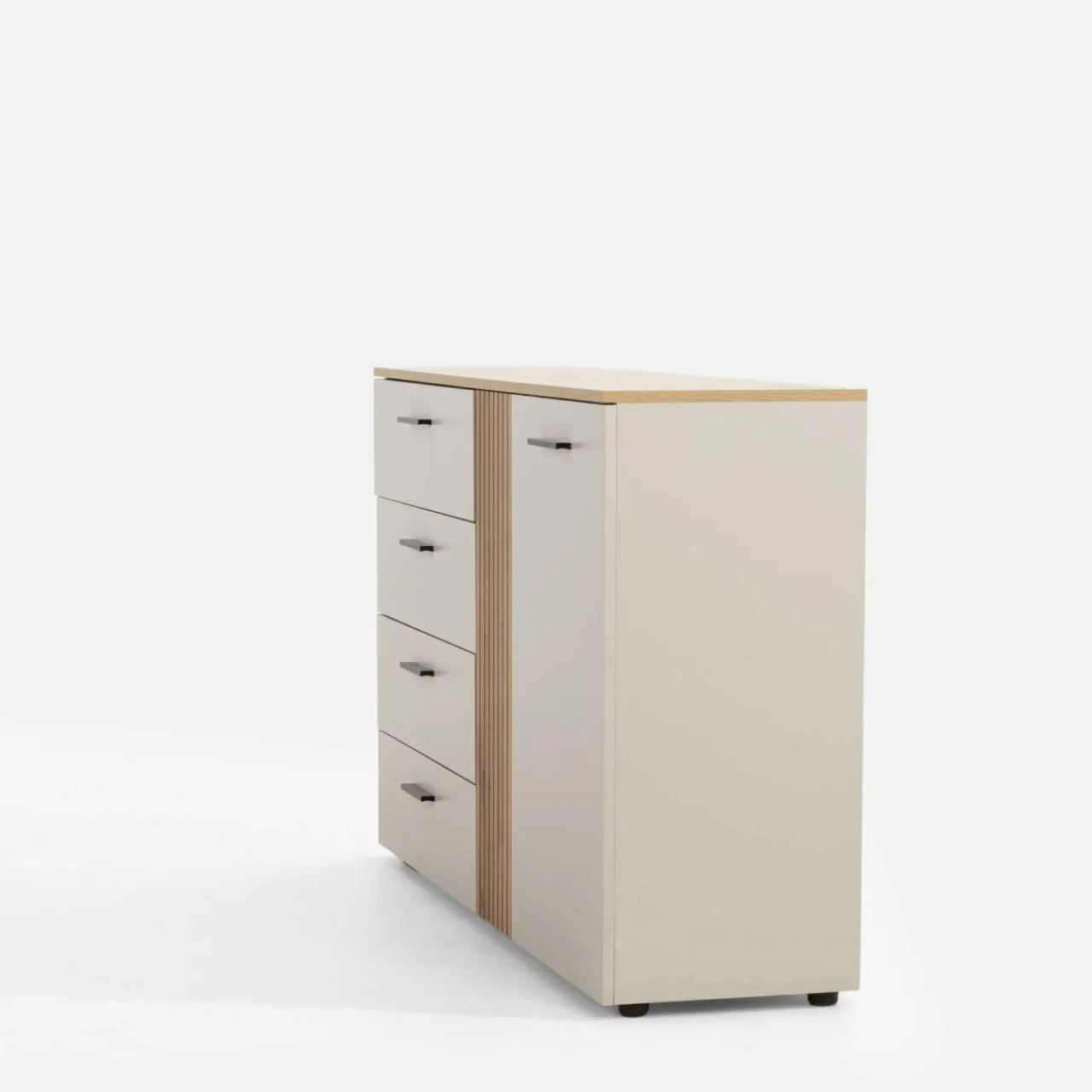Zachowaj porządek w salonie z komodą FREZO. W szufladach oddzielisz tekstylia od dokumentów i drobnych przedmiotów. W bocznej szafce przechowasz resztę większych rzeczy.