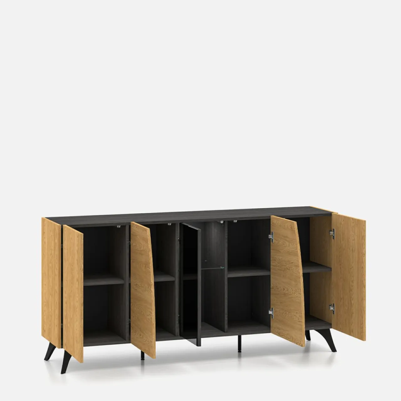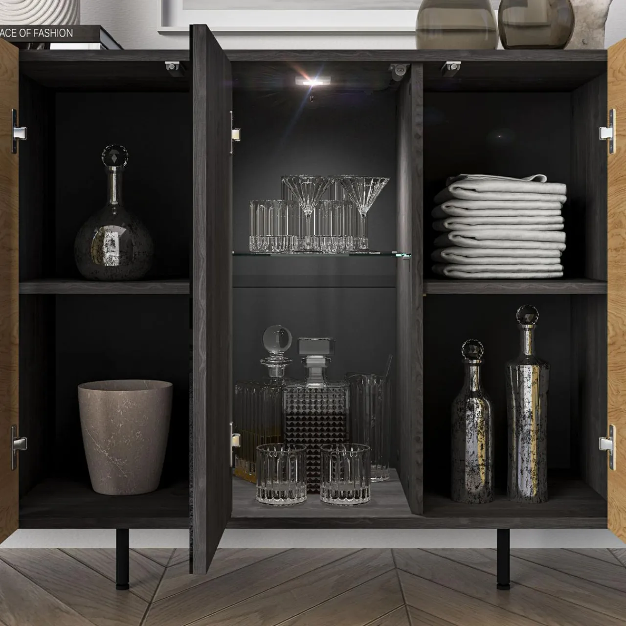 Komoda TOSCANIA posiada ukryty barek za szklaną częścią. Podświetlany i ze szklaną półką świetnie sprawdzi się na przechowywanie cięższych trunków i kompletu kryształowych szklanek.