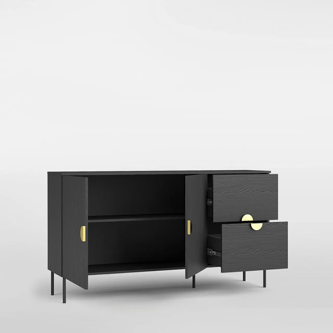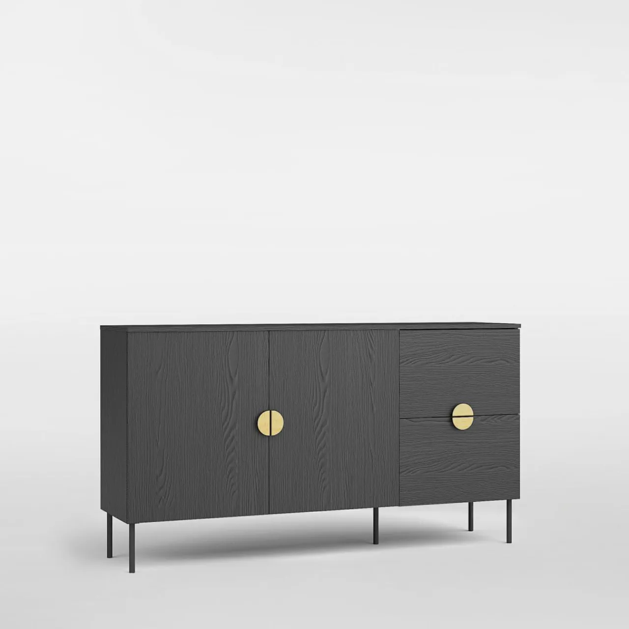 - Meble charakteryzuje czarne wykończenie. Ciemną i elegancką kolorystykę dopełnia rysunek drewna.