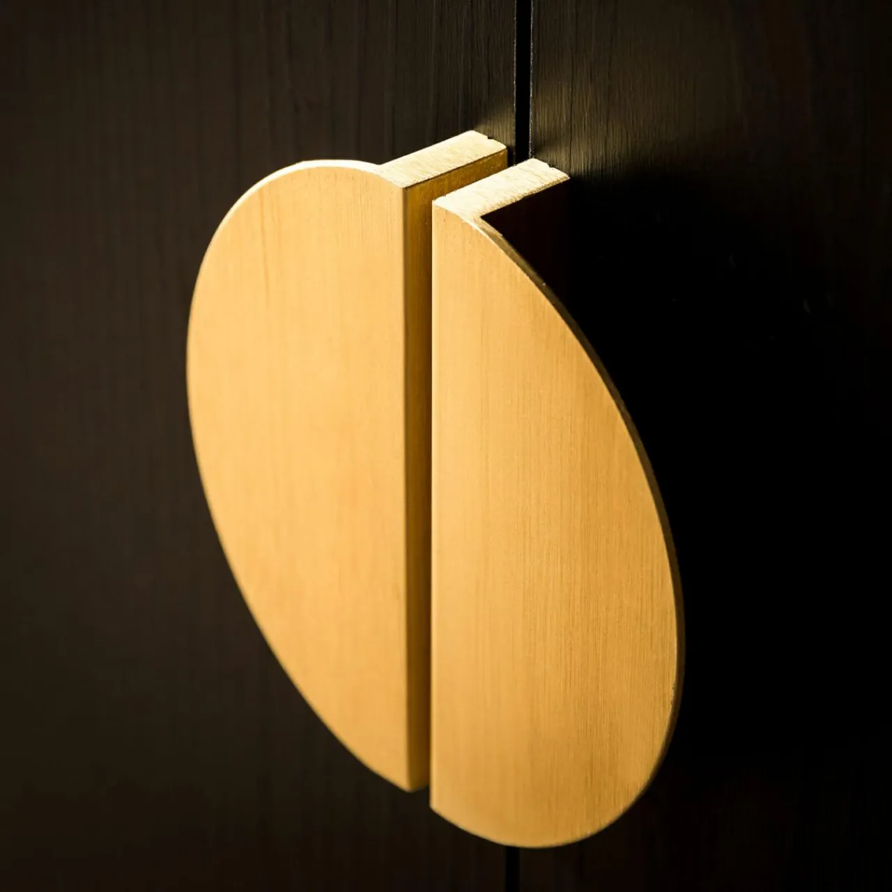 - Półokrągłe metalowe uchwyty wyraźnie odznaczają się na frontach, tworząc kontrast dla ciemnych mebli.
