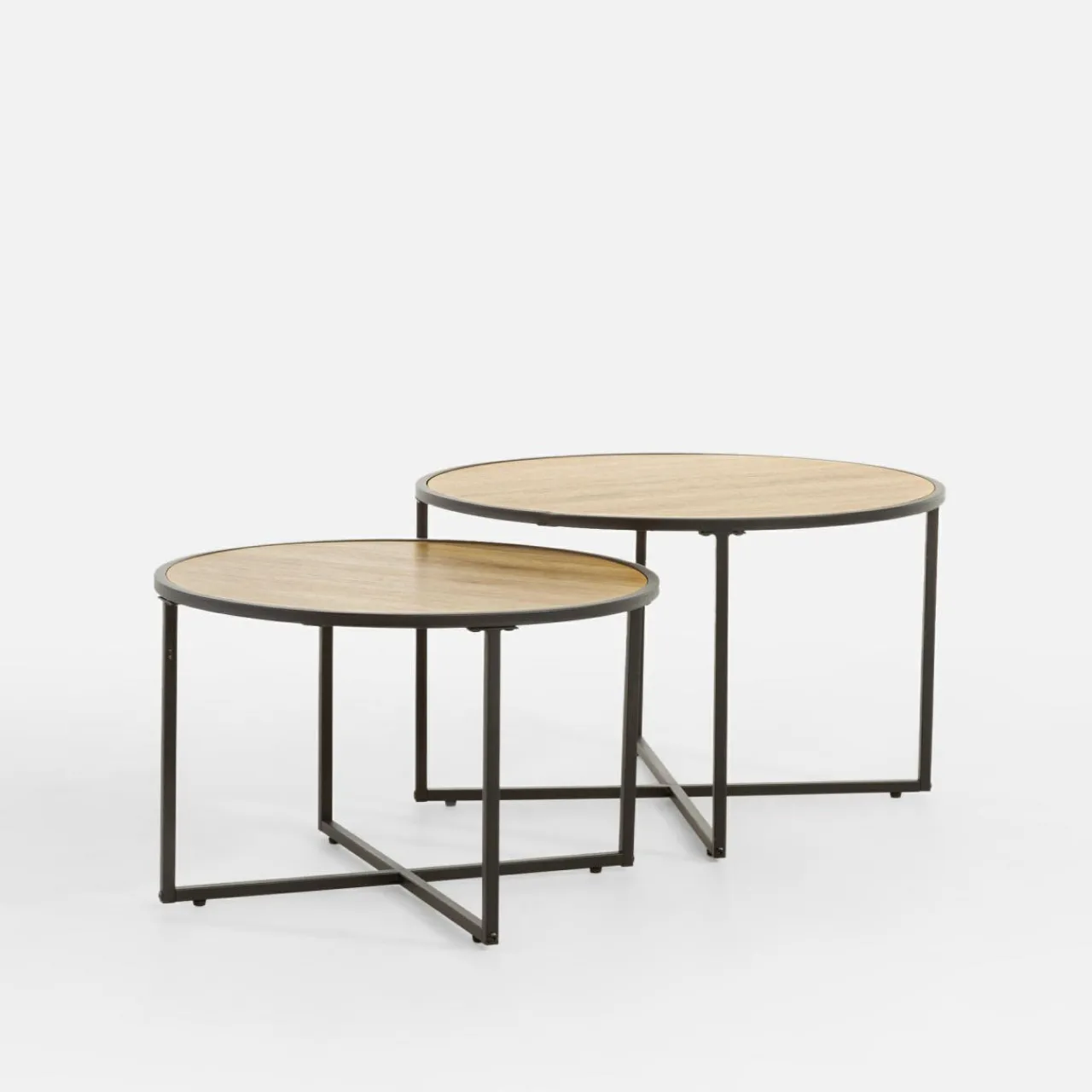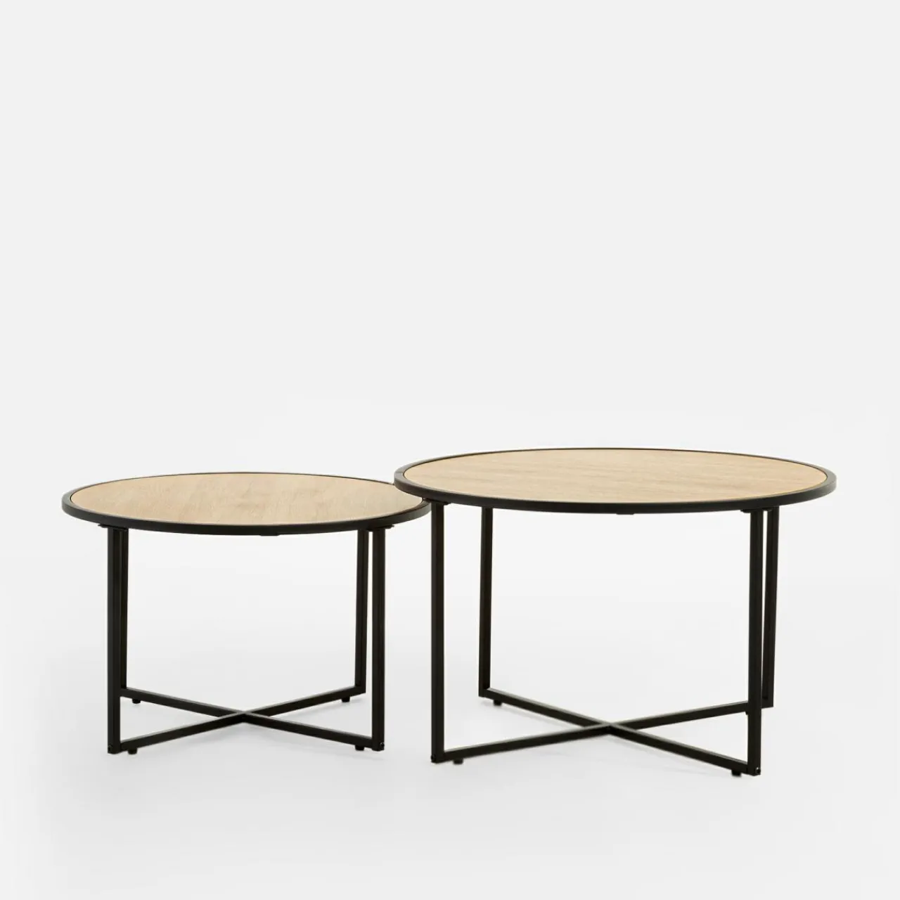 Komplet 2 stolików HALONE świetnie odnajdzie się w salonie w stylu industrialnym. Jasne wybarwienie blatu nie przytłoczy wnętrza. Matowa czarna podstawa nada mu nowoczesnego charakteru. Stolików możesz używać razem lub osobno – oba zapewnią mnóstwo miejsca na pracę z laptopem czy podanie przekąsek.