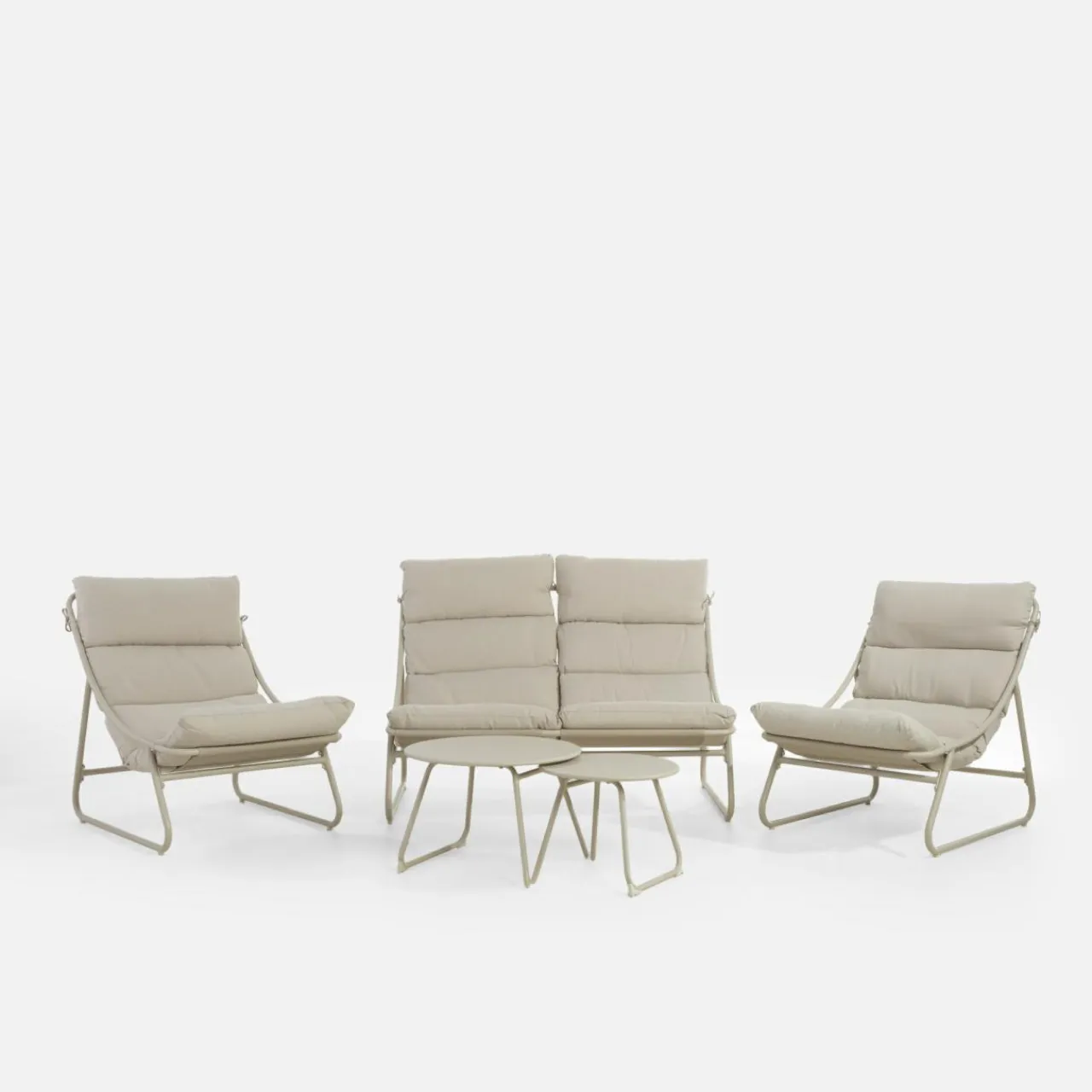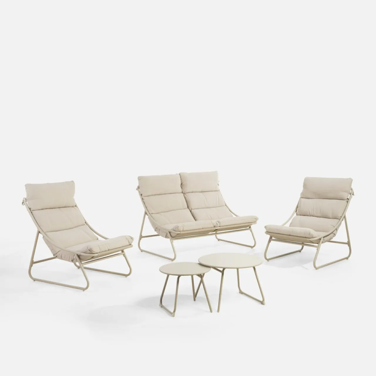 Zatop się w miękkich siedzeniach kompletu ogrodowego HUNDIGO. Budowa przypominająca hamak, dopełniona miękkimi poduszkami zachęca do spędzania wolnych chwil na świeżym powietrzu.