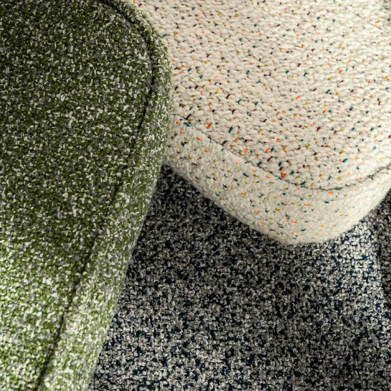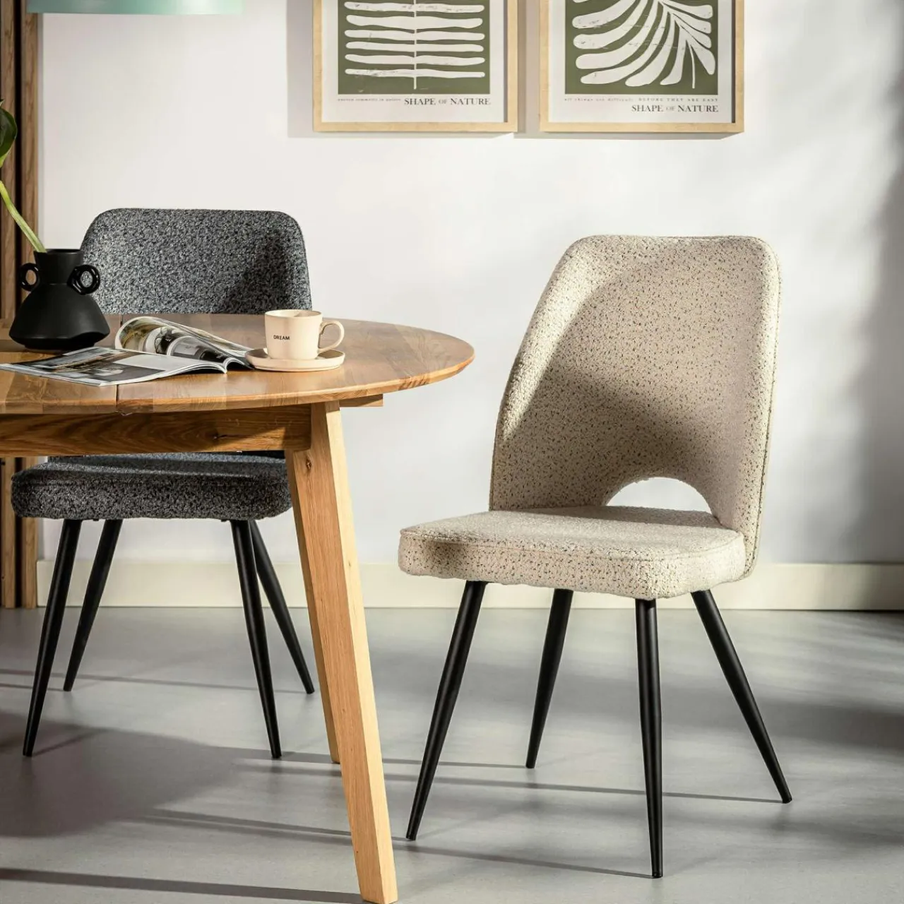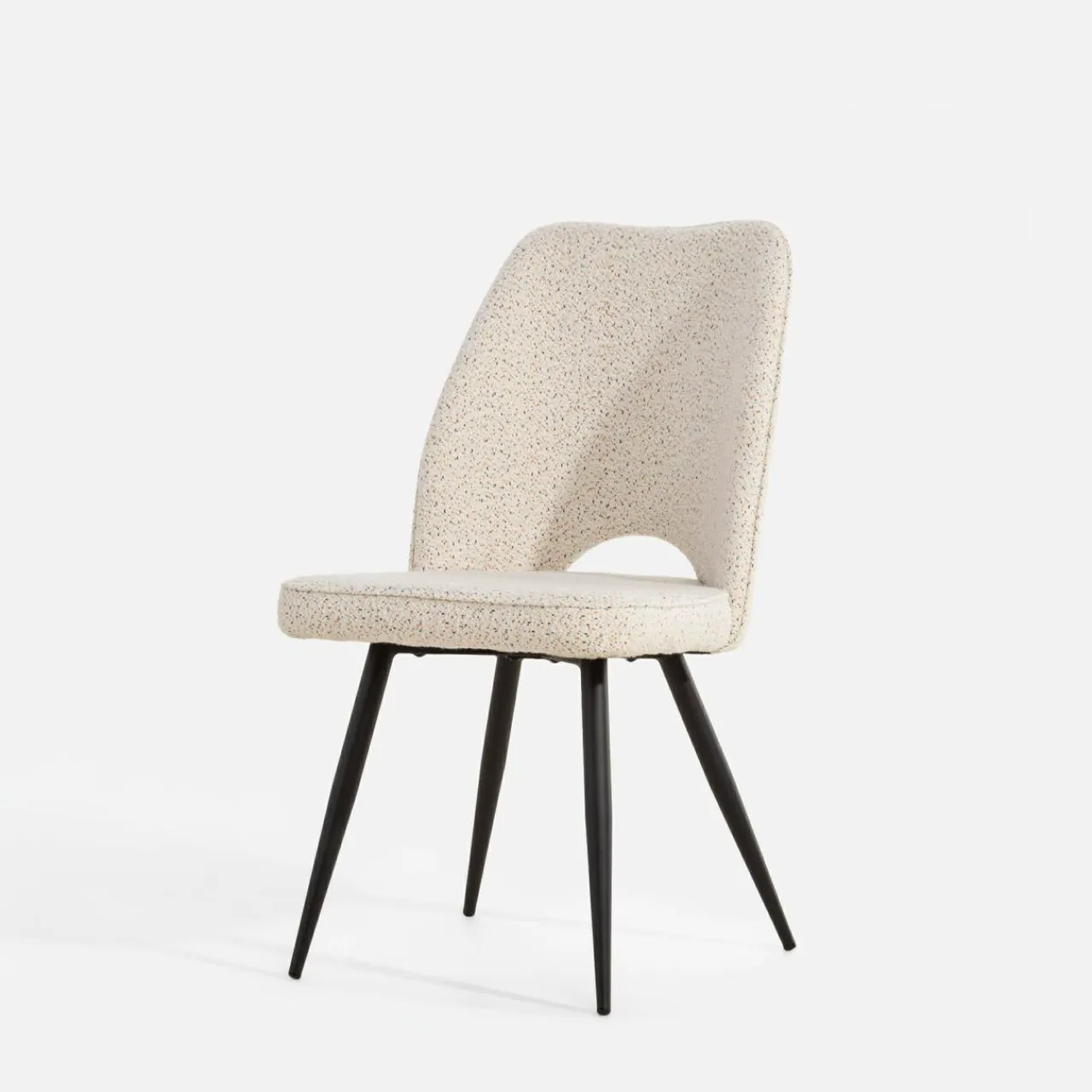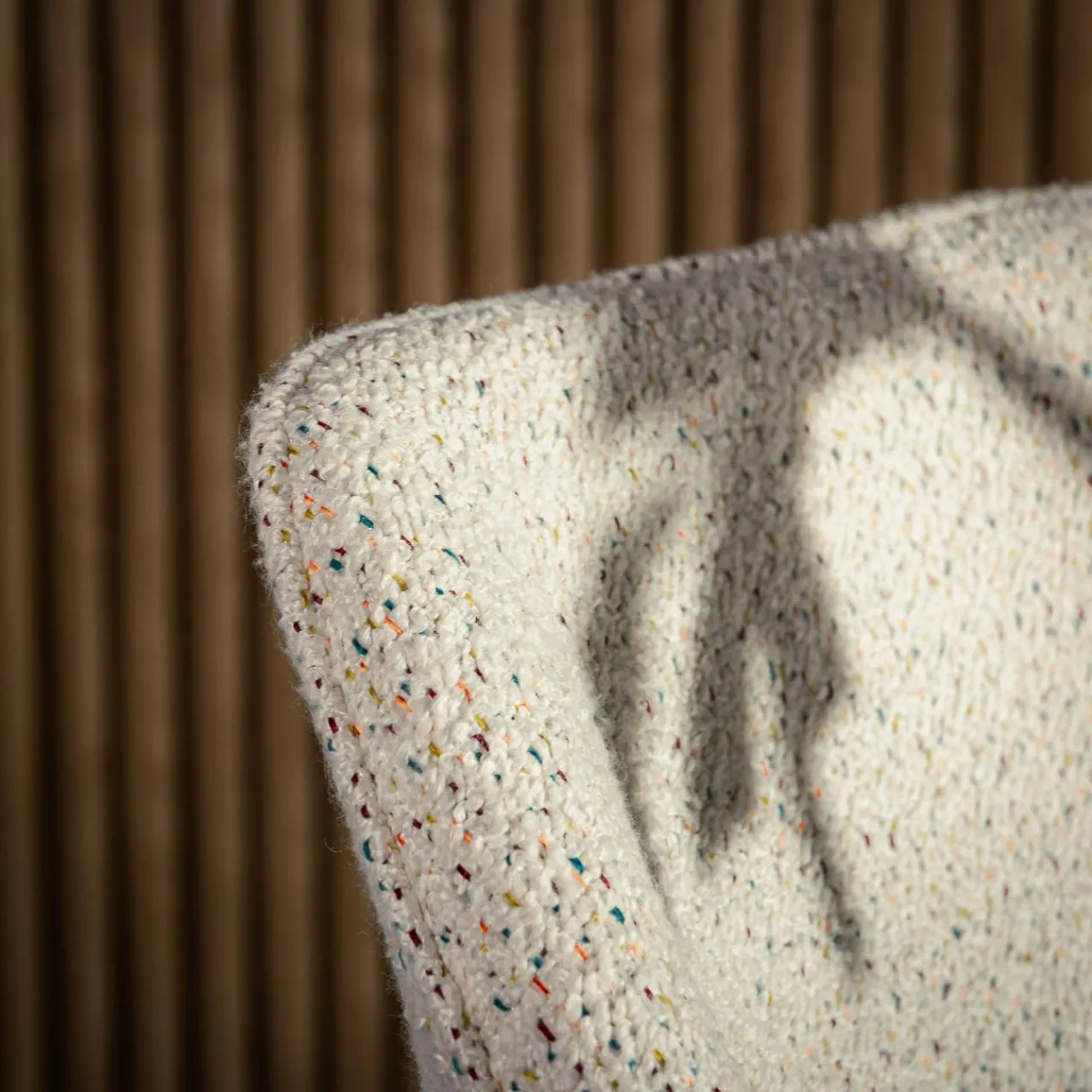 - Melanżowa, biała tkanina z kolorowymi nitkami sprawia, że krzesło wyróżnia się na tle pomieszczenia. Będzie wesołym elementem w stonowanej jadalni — przypomina śmietankowe lody udekorowane tęczową posypką!