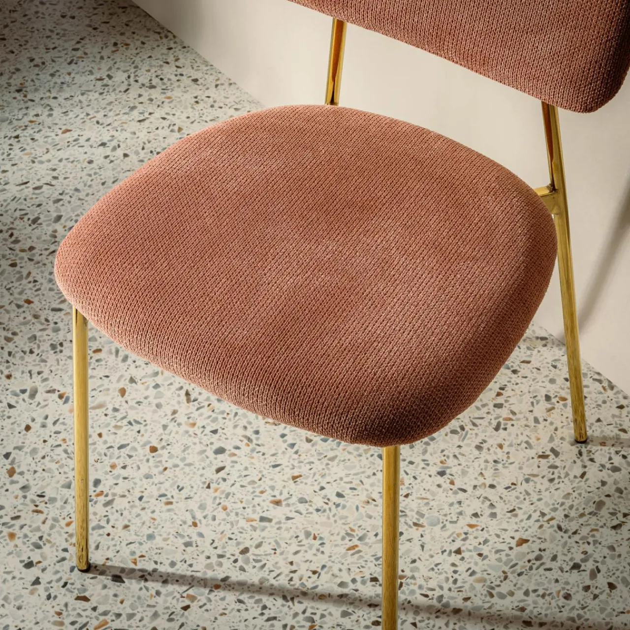 Gustujesz w eleganckich wnętrzach? Krzesło ERMENIO urzeknie Cię stylowym połączeniem różu i złota – pięknie wkomponują się w jadalnię urządzoną w stylu glamour lub art deco.