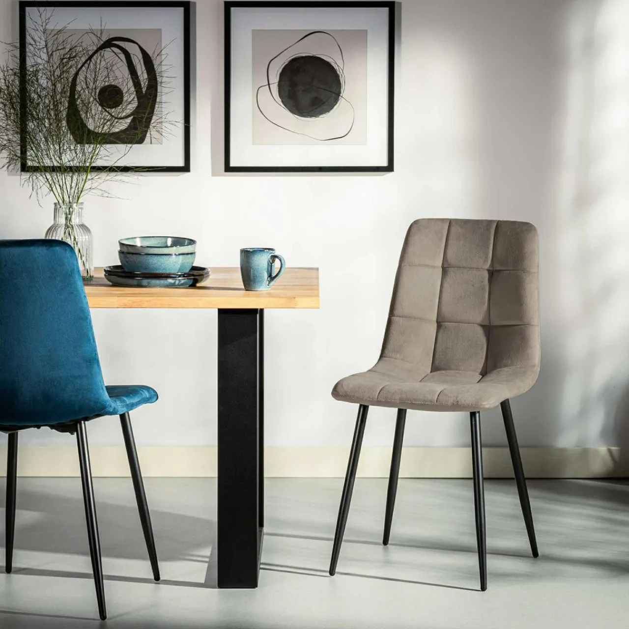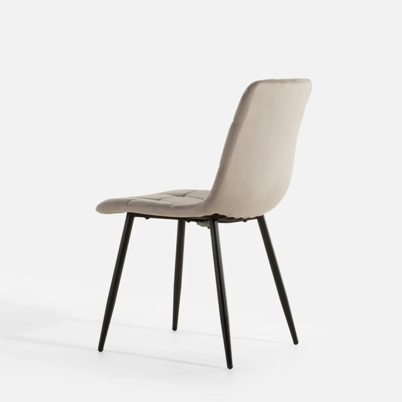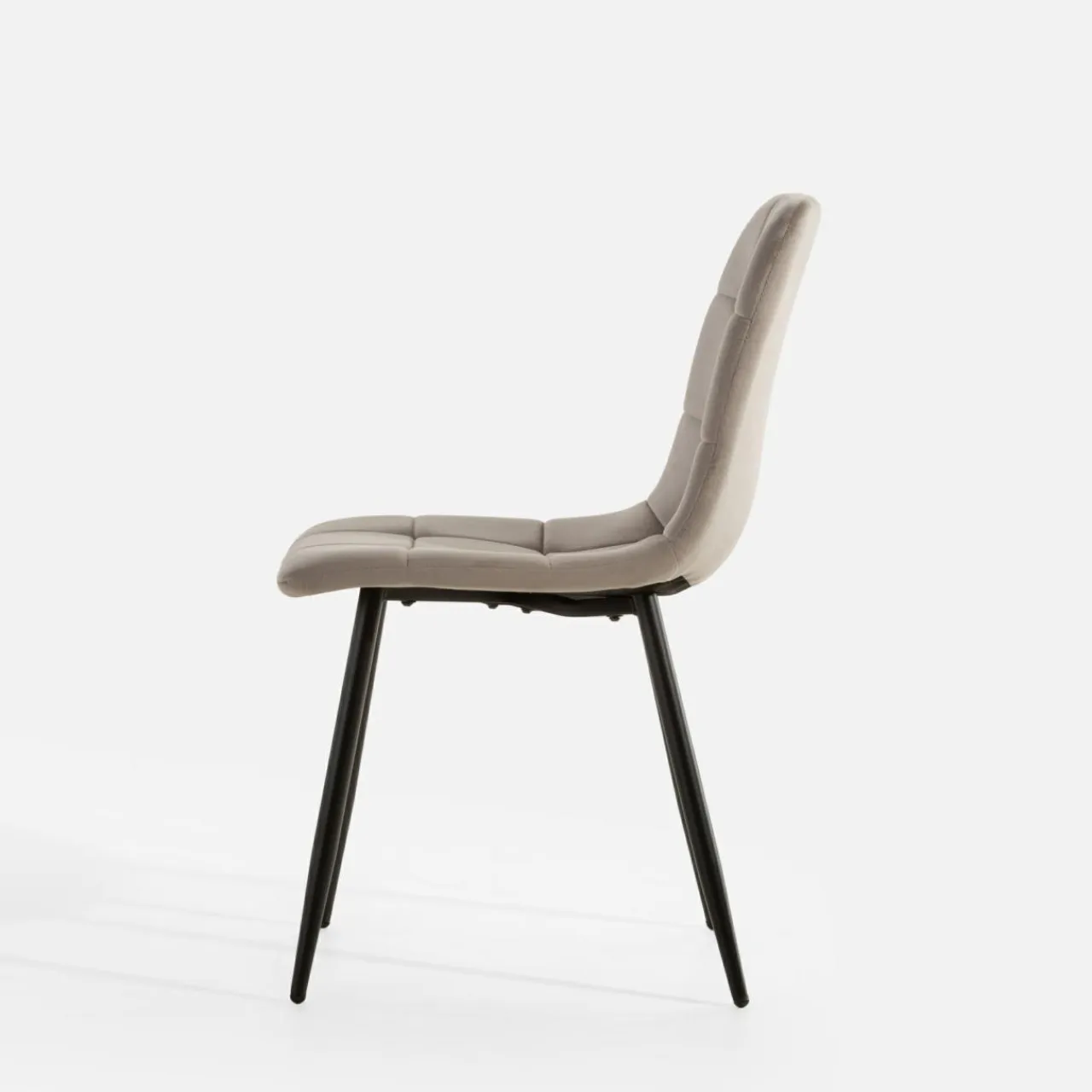 Krzesło JYRANDO wprowadzi do wnętrza nutę nowoczesności. Wykończenie z ciemnobeżowego miękkiego weluru wygląda stylowo, a geometryczne przeszycia dodadzą jadalni ciekawego akcentu.