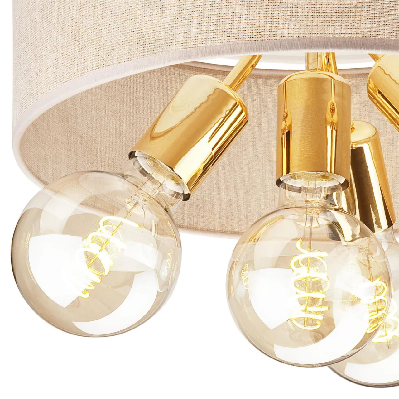 Zawieś ją w salonie, a błyszczące, wykończenie w złotym kolorze przy żarówkach ociepli wnętrze, podobnie jak abażur w beżowym odcieniu.