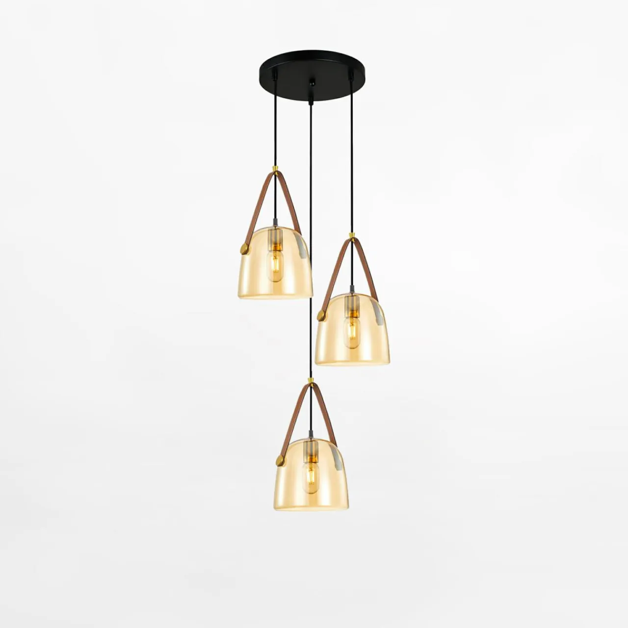 - Modny kształt lampy oparty jest na 3 kloszach o kształcie kopuł. Wszystkie zostały wykonany ze szkła w bursztynowym odcieniu.