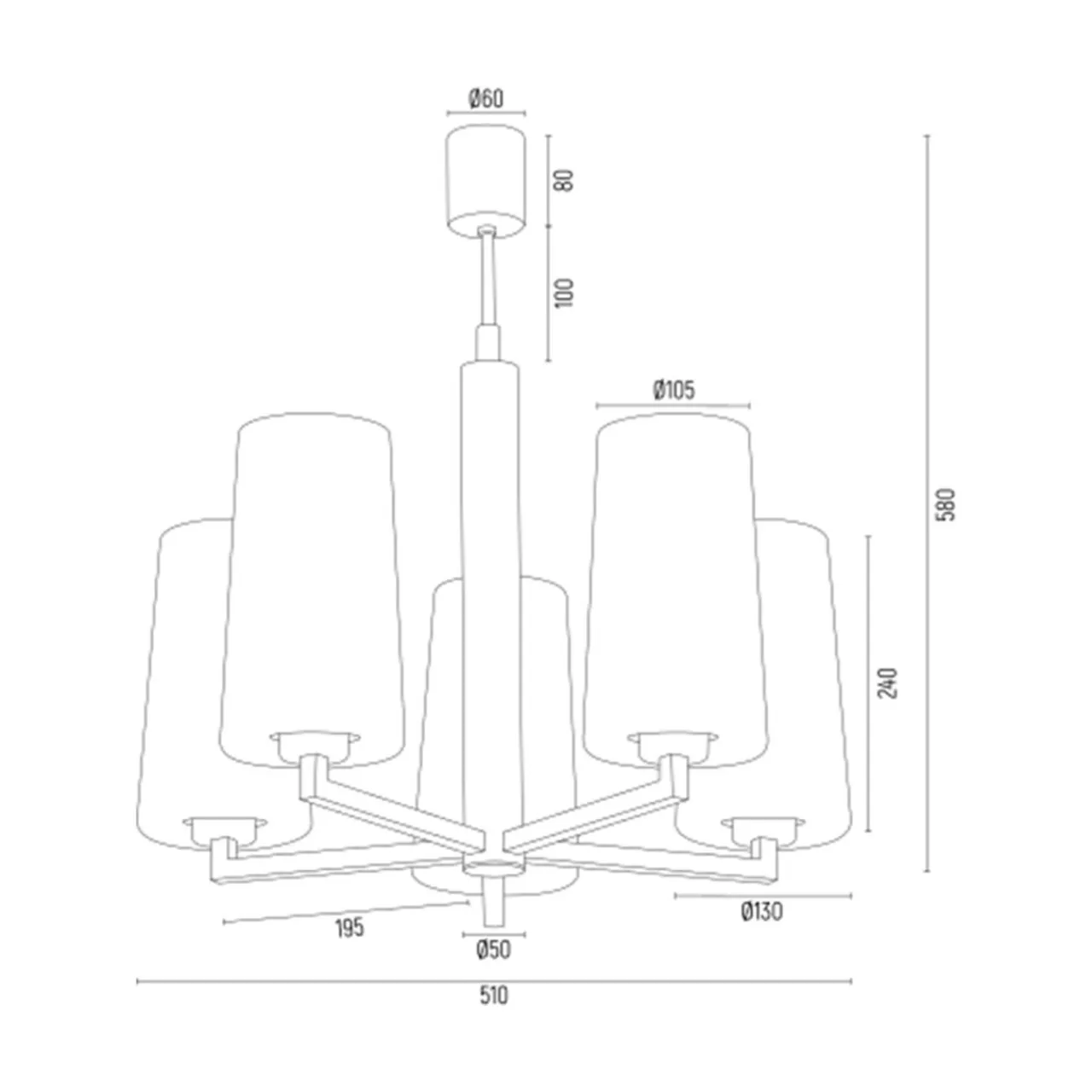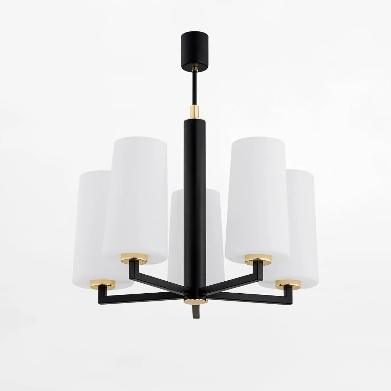 Posiada stelaż i ramiona w czarnym, matowym kolorze z 5 kloszami z mlecznego szkła. Pomostem miedzy nimi jest złoty element dekoracyjny, umieszczony przy oprawach żarówek.