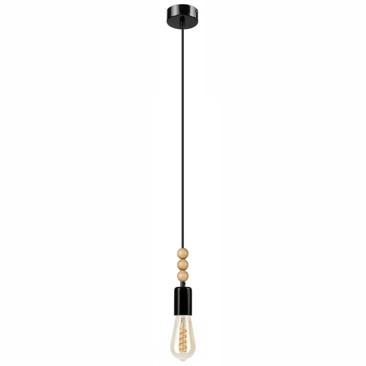 - Nietypowy wygląd lampy podkreśla jej wyjątkowość – 3 drewniane, ozdobne kule przy oprawie to niewielki, lecz oryginalny dodatek.
