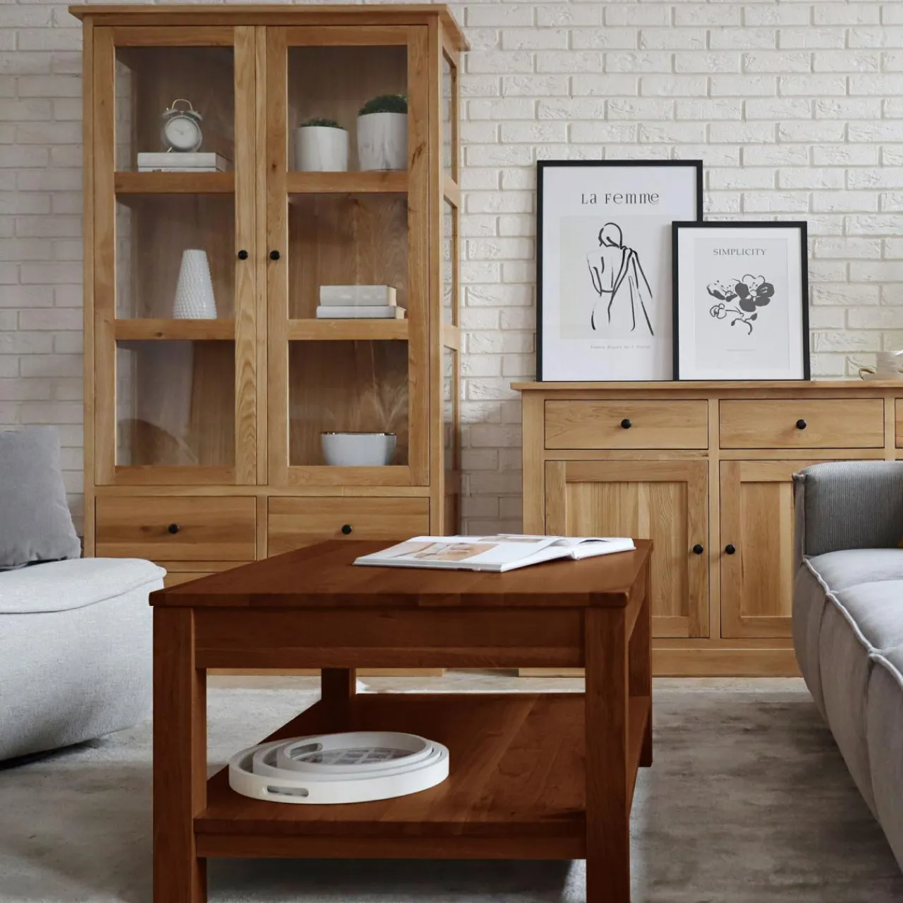 - Dąb koniakowy – głębszy, intensywniejszy odcień, który świetnie współgra z ciemniejszymi tkaninami, skórzanymi sofami oraz dodatkami w kolorze złota czy butelkowej zieleni. Dedykowany miłośnikom wyrazistych i eleganckich wnętrz.