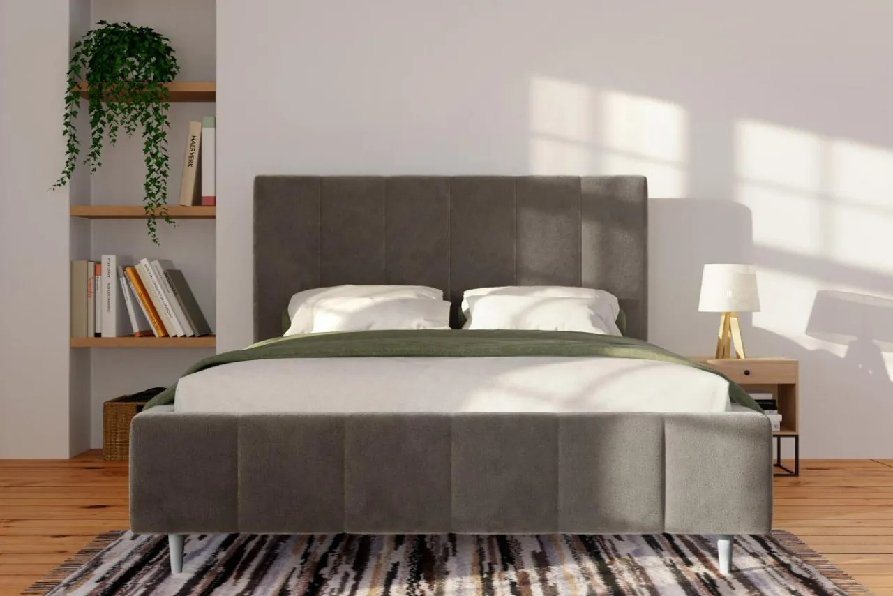 Łóżko STELLA pokryto miękką, brązową tkaniną, która doda ciepła do Twojej sypialni. Oprzyj się na miękkim wezgłowiu i złap oddech przed snem.