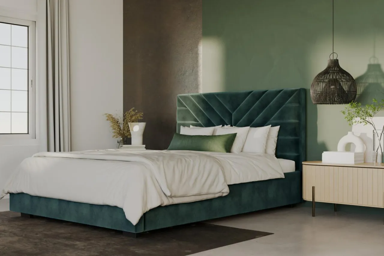 Welurowe łóżko NICOLA wpisze się w wystrój eleganckiej sypialni. Ciemnozielony kolor świetnie przełamie neutralny wystrój, dzięki czemu Twoje wnętrze zyska intymnego charakteru.