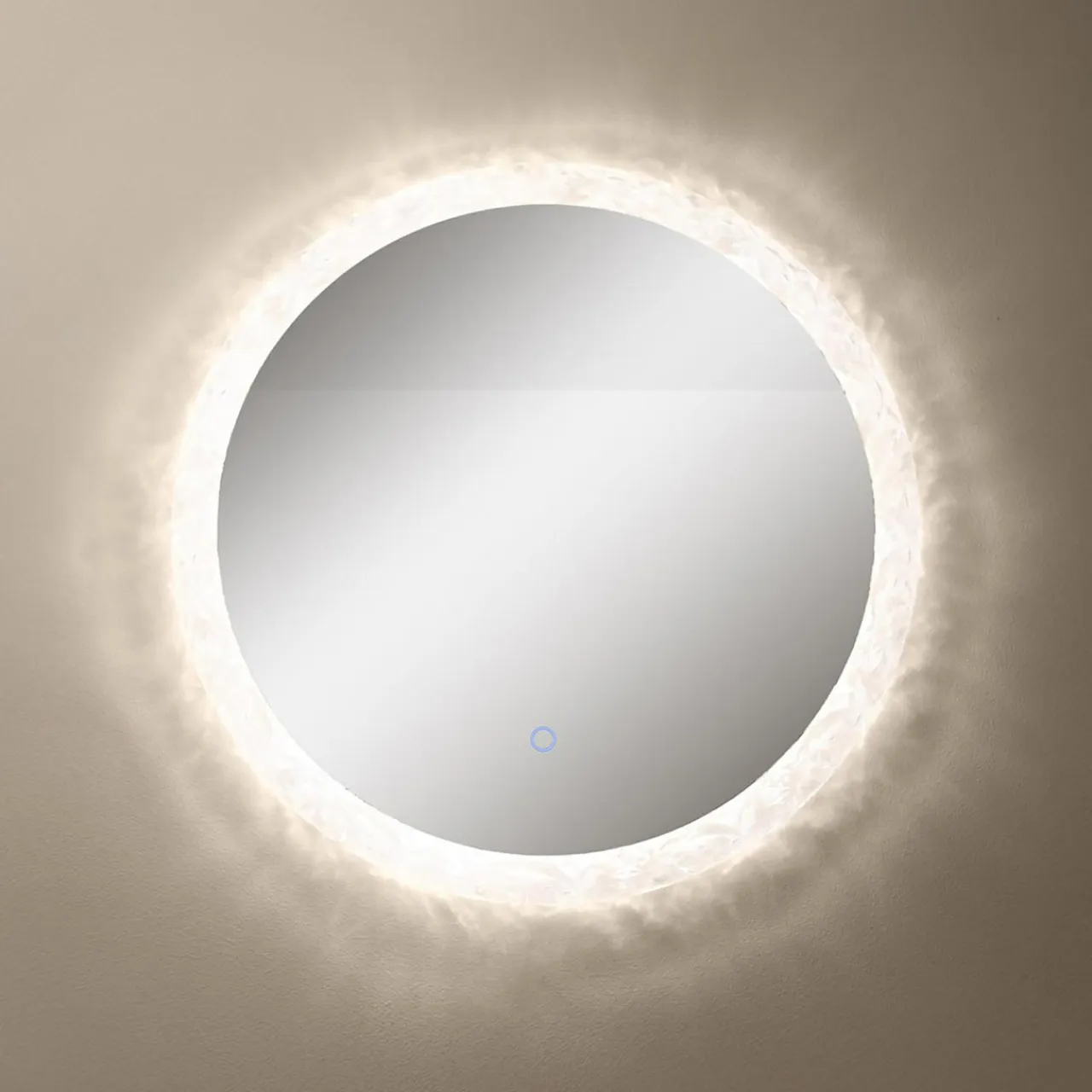 - Oświetlenie LED ukryte w ozdobionej akrylowymi kryształkami ramie otacza okrągłą taflę lustra. Dzięki temu jego powierzchnia jest zawsze dobrze doświetlona.
