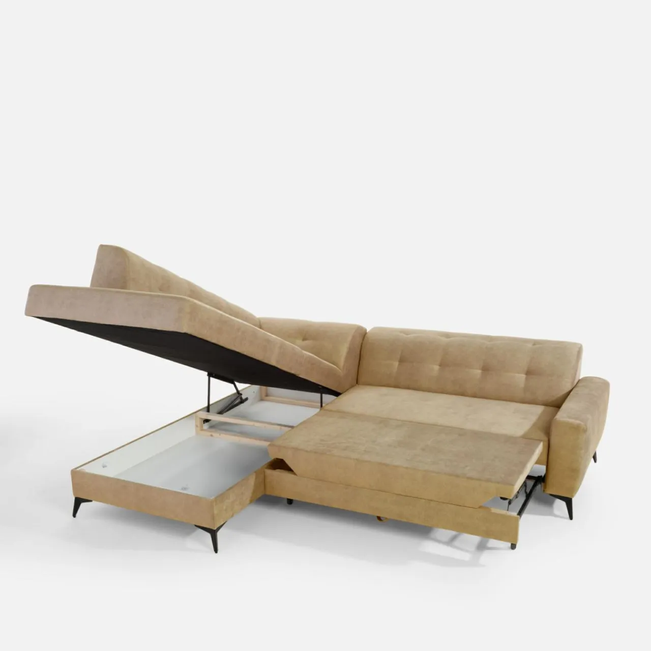 Stelaż pod siedziskiem wysuwamy i podnosimy za pomocą uchwytu. Mebel nie wymaga odsuwania od ściany. Idealny do okazjonalnego spania.