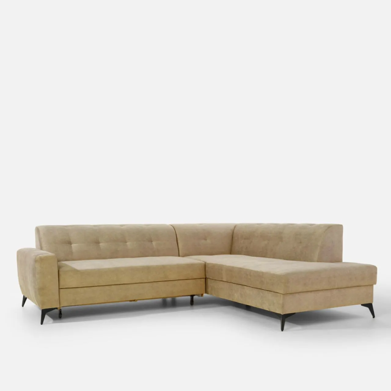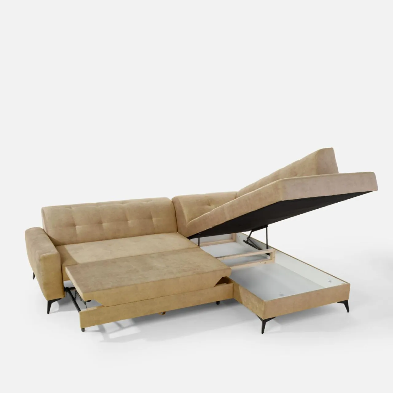 Stelaż pod siedziskiem wysuwamy i podnosimy za pomocą uchwytu. Mebel nie wymaga odsuwania od ściany. Idealny do okazjonalnego spania.