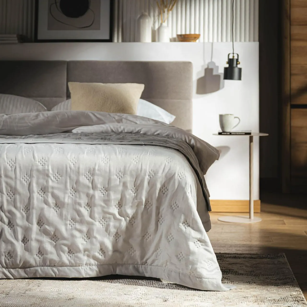 Jasnoszara narzuta CLOUD o wymiarach 180×200 cm pasuje do brązowych, czarnych oraz oraz zielonych mebli.