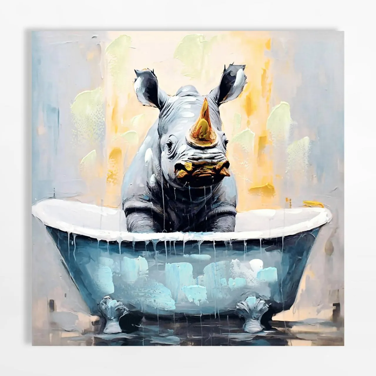 Uzupełnij wystrój łazienki, wieszając na ścianie obraz na płótnie z nosorożcem w wannie – spodoba się miłośnikom przyrody i sztuki współczesnej. W niektórych miejscach grafika została pokryta ręcznie farbą. Dekoracja zyskuje modny i bardziej naturalny wygląd.