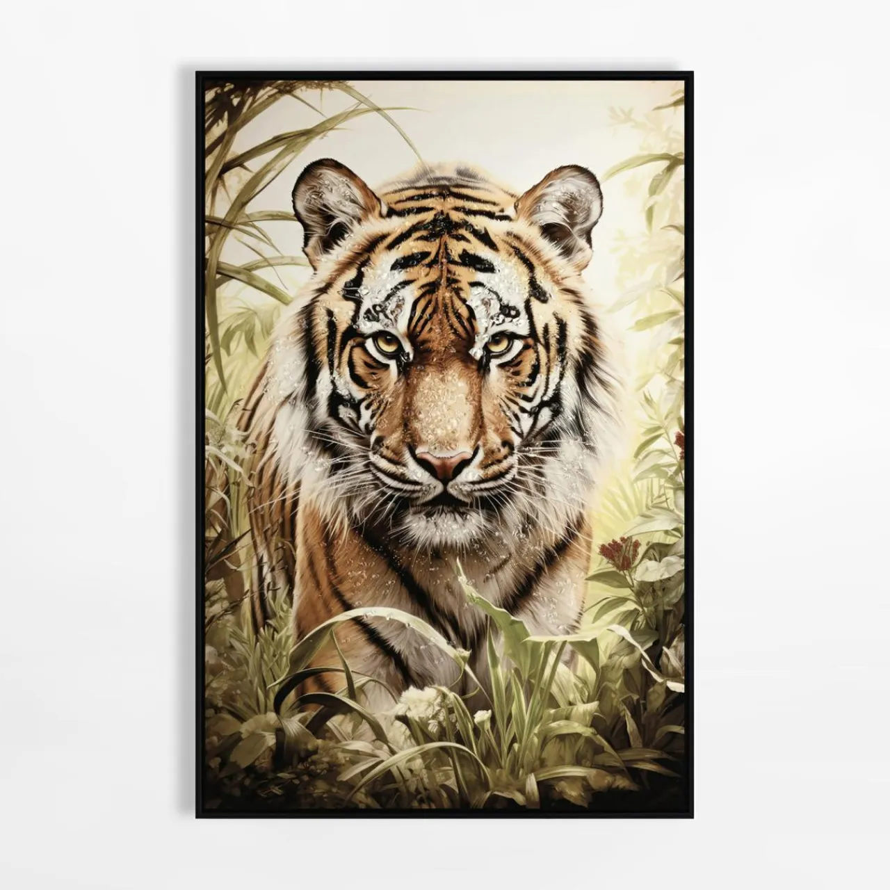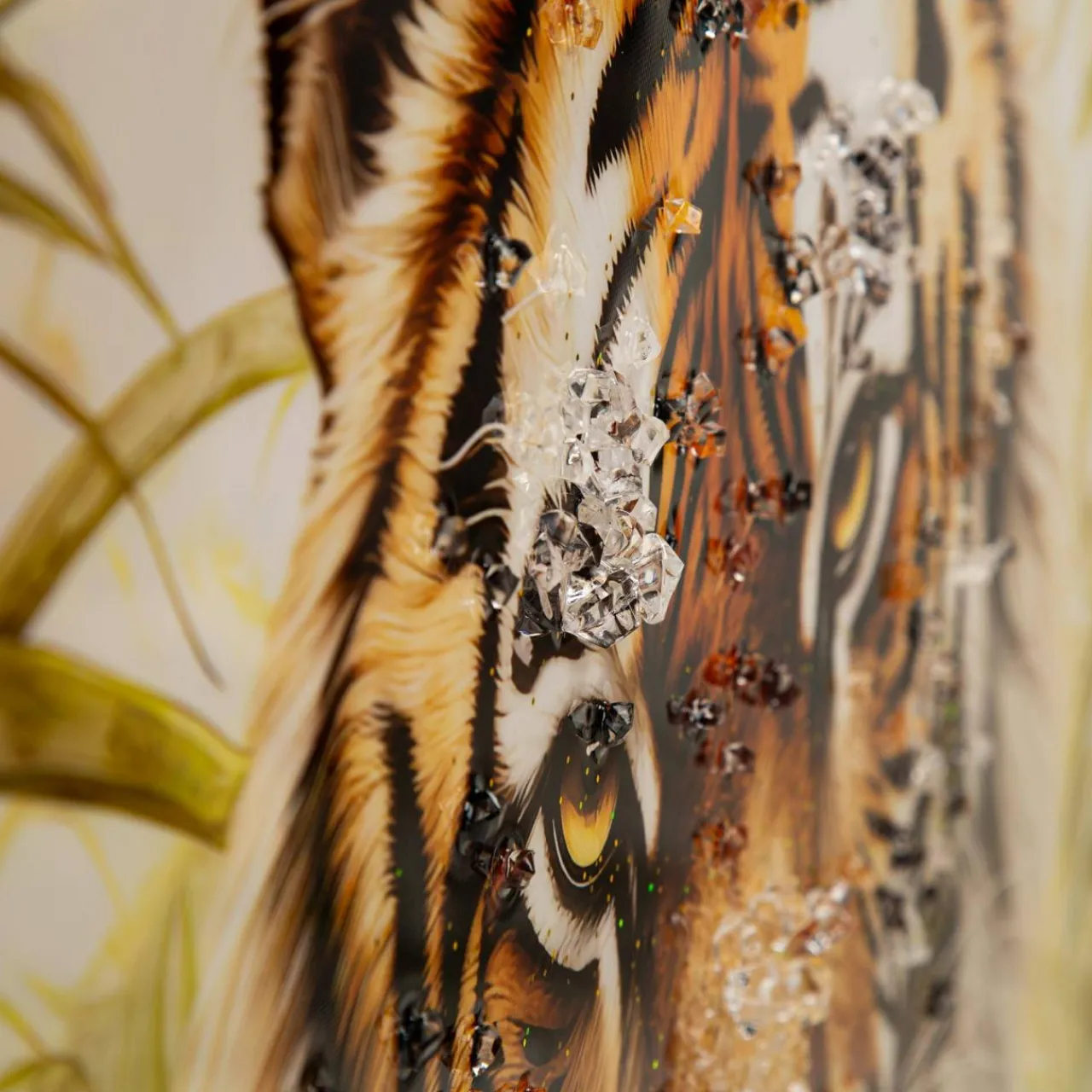 Obraz na płótnie TYGRYS przykuje uwagę akrylowymi dodatkami, dzięki którym delikatnie połyskuje.