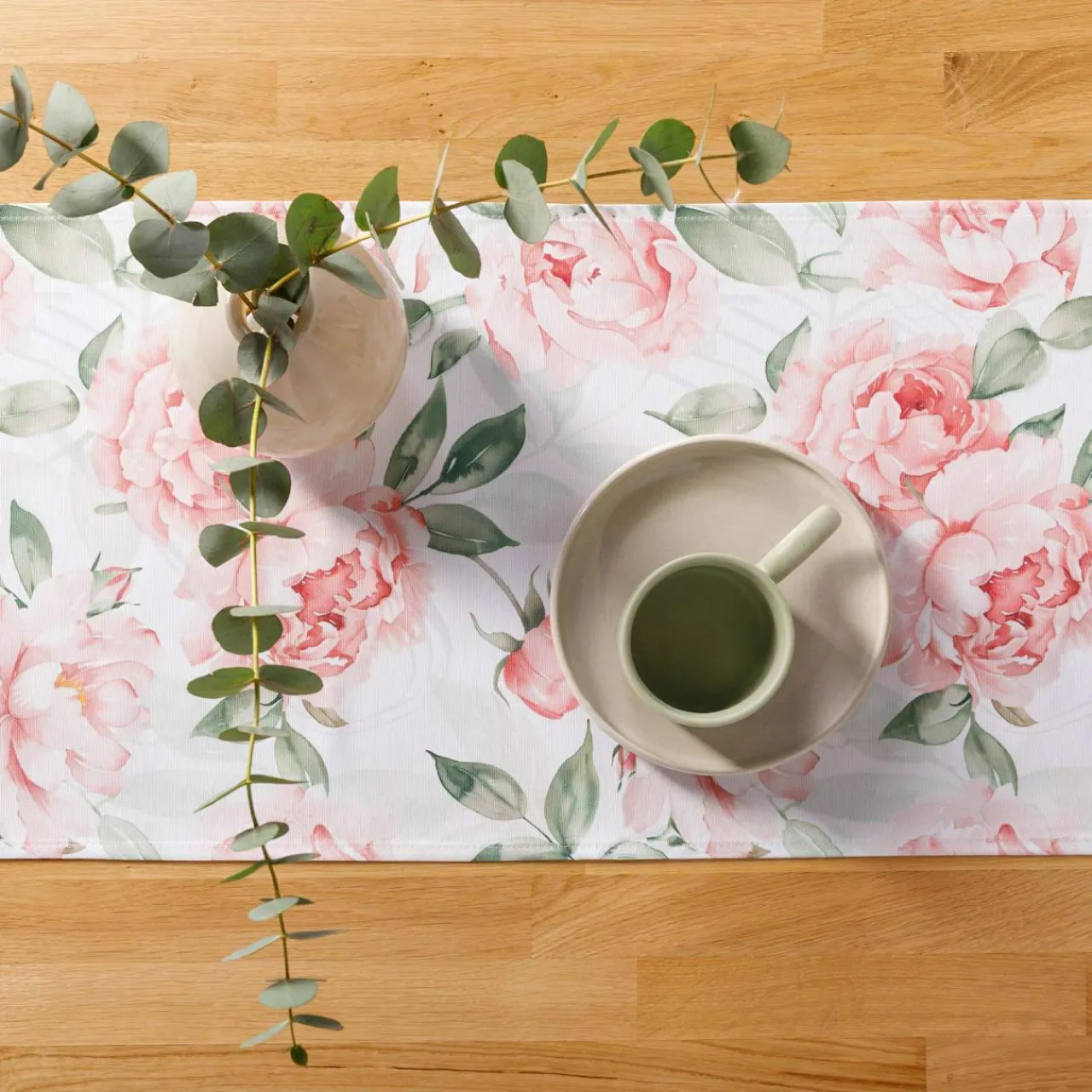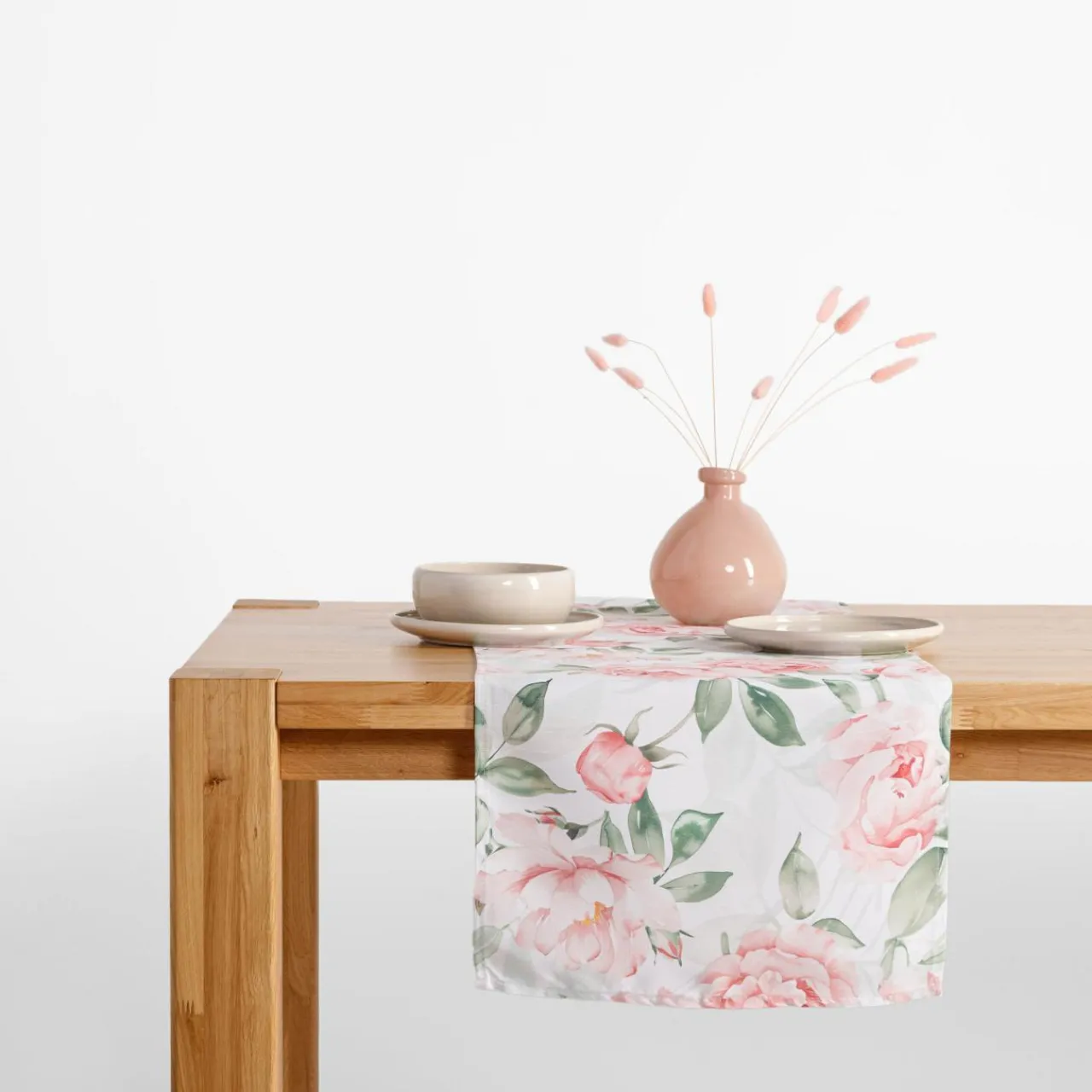 Obrus Gardena to wyjątkowy element dekoracyjny, który wniesie do wnętrza świeżość i elegancję. Jego piękny wzór różowych piwonii nadaje mu romantyczny oraz subtelny charakter, doskonale komponując się z klasycznymi jak i nowoczesnymi aranżacjami. Rozmiar 40×120 cm sprawia, iż świetnie sprawdzi się na małych stołach, stolikach kawowych czy ławach.