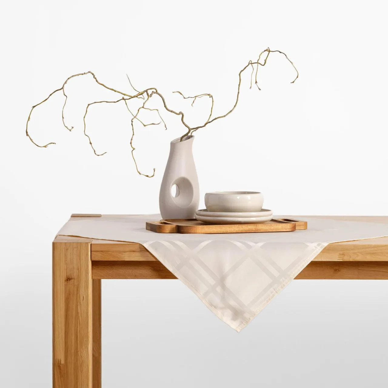Obrus Cascade to elegancki oraz stylowy dodatek do wnętrza, który dzięki kremowej kolorystyce i delikatnemu wzorowi kremowej kraty tworzy ponadczasowy, klasyczny efekt. Tkanina z której wykonano obrus jest trwała i łatwa w pielęgnacji. Jego kompaktowy rozmiar 85×85 cm sprawia, iż idealnie sprawdzi się na małych stołach, stolikach kawowych czy jako dekoracyjna serweta.