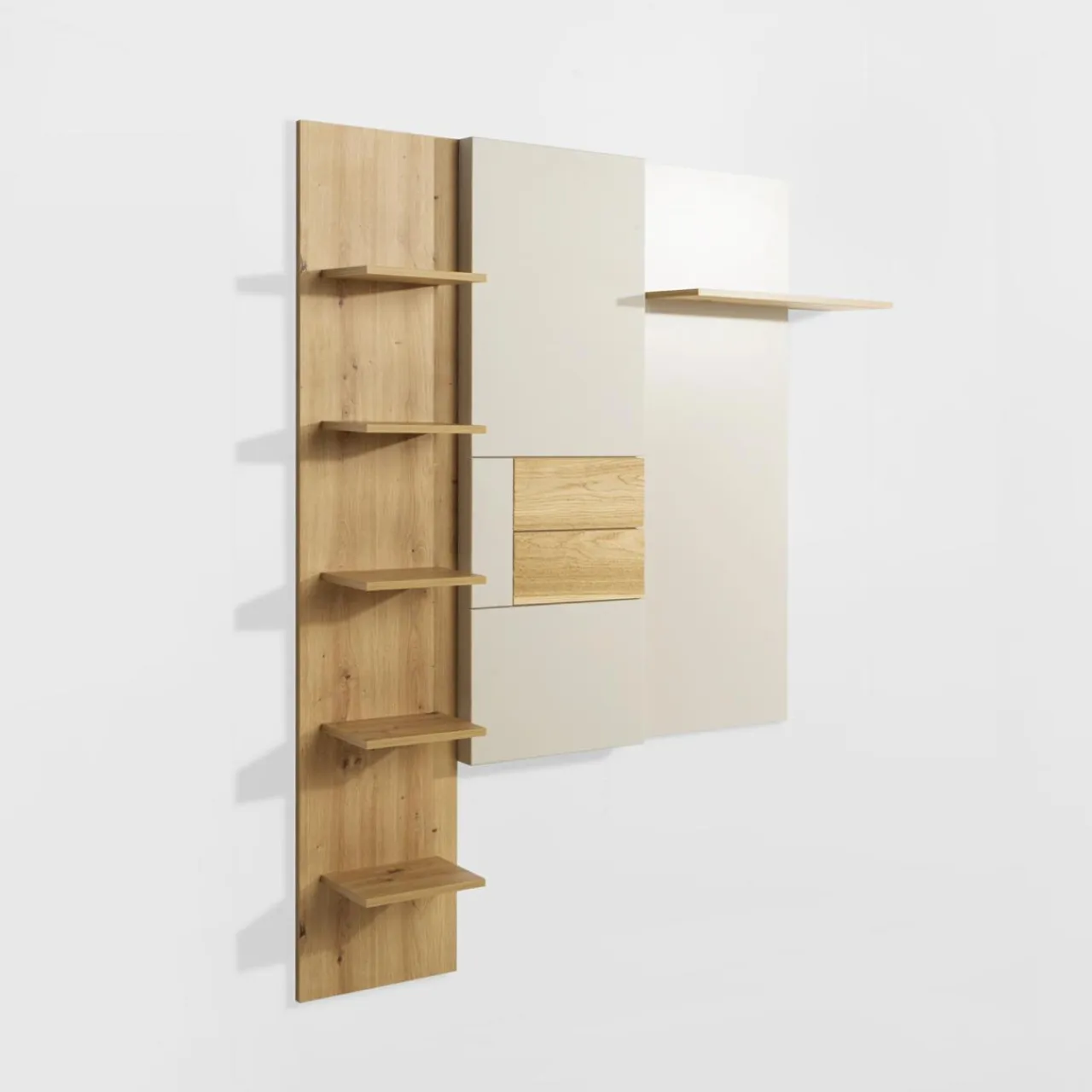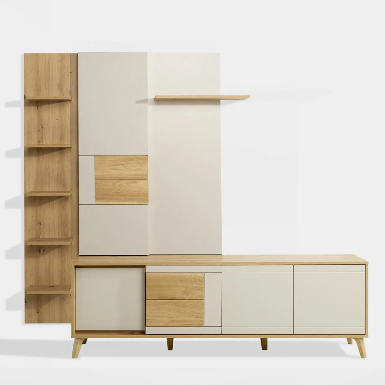 Beżowe bryły rozjaśnią wnętrze, a fronty ze wstawkami z prawdziwego drewna w kolorze dąb artisan nadadzą naturalnego akcentu.