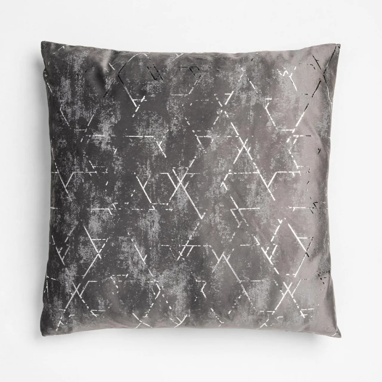 Szara poduszka z kolekcji NORAH ze srebrnym, połyskującym wzorem doda wnętrzu elegancji oraz blasku.