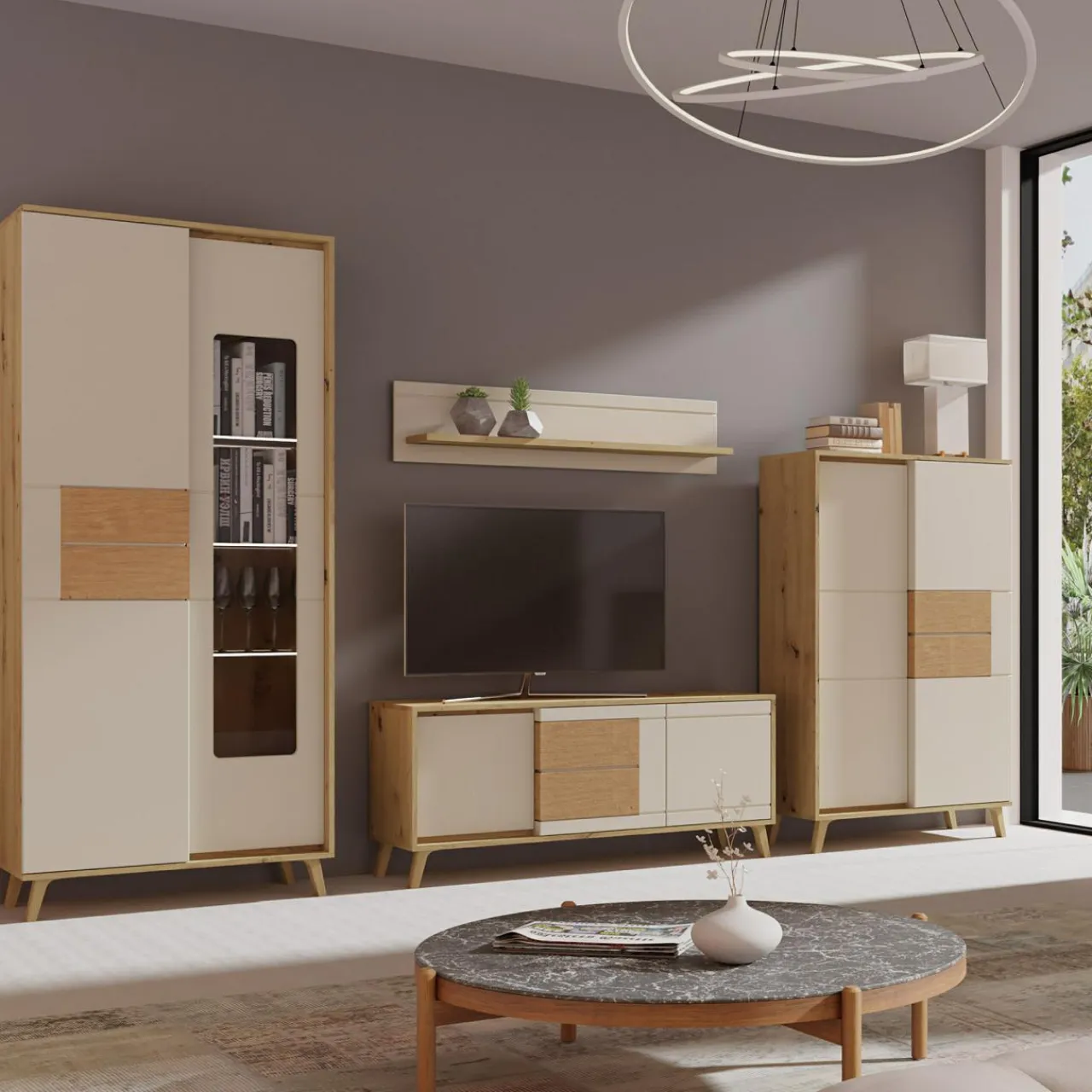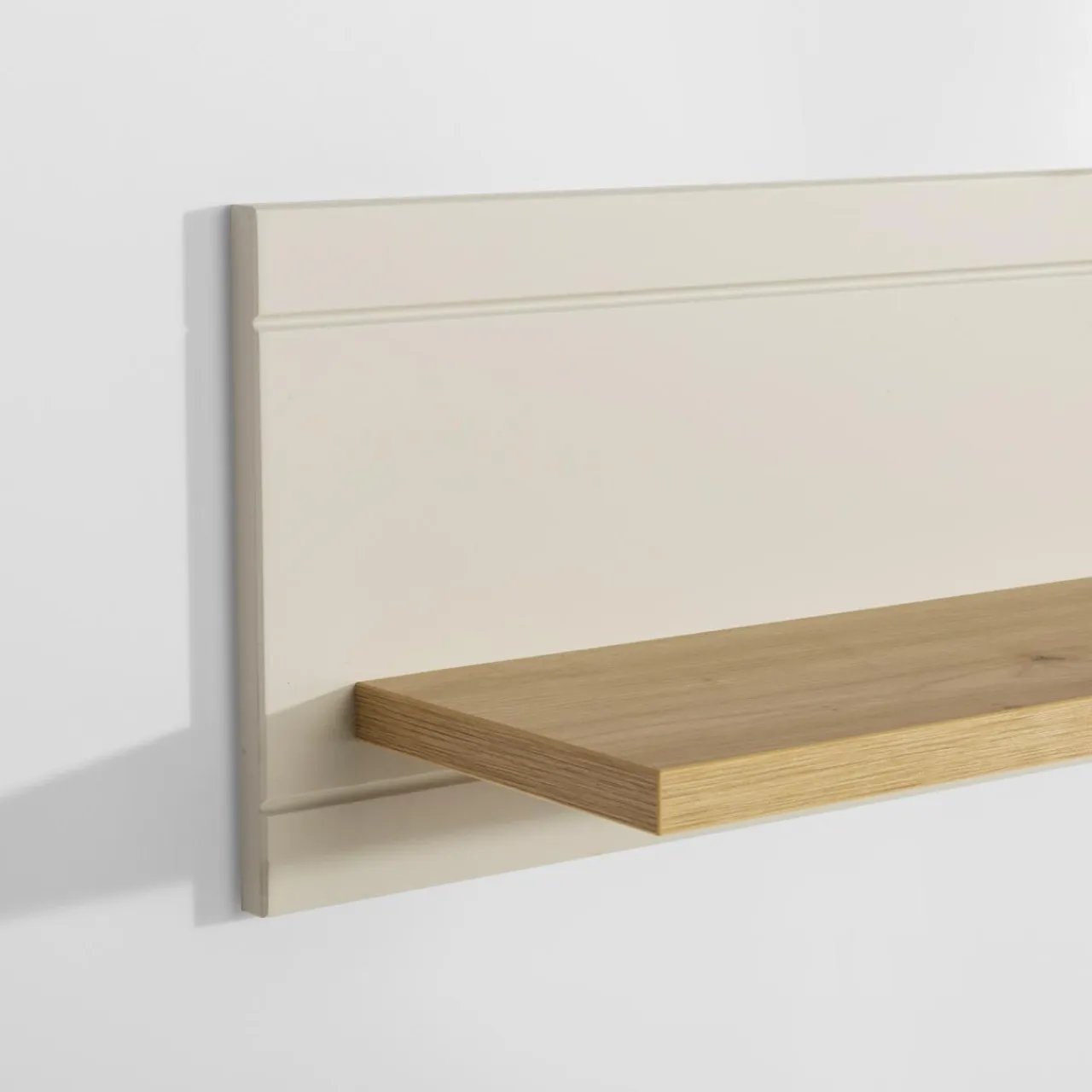 Beżowe bryły rozjaśnią wnętrze, a fronty ze wstawkami z prawdziwego drewna w kolorze dąb artisan nadadzą naturalnego akcentu.
