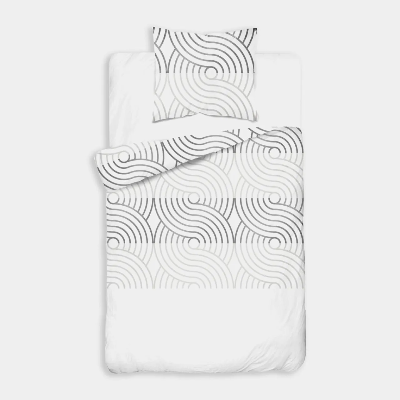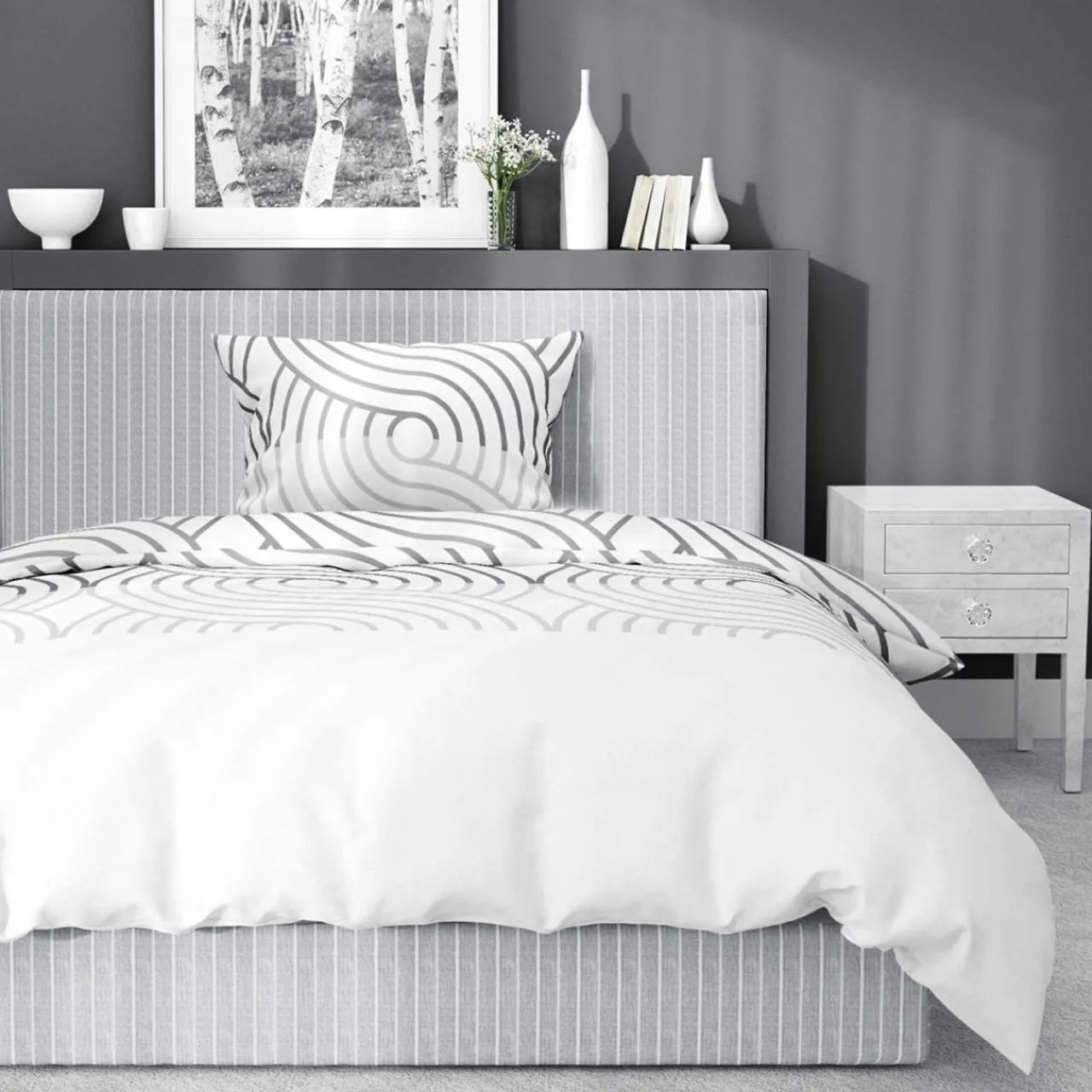 Biała pościel HOME SATIN o geometrycznym wzorze rozjaśni i uatrakcyjni Twoją sypialnię.