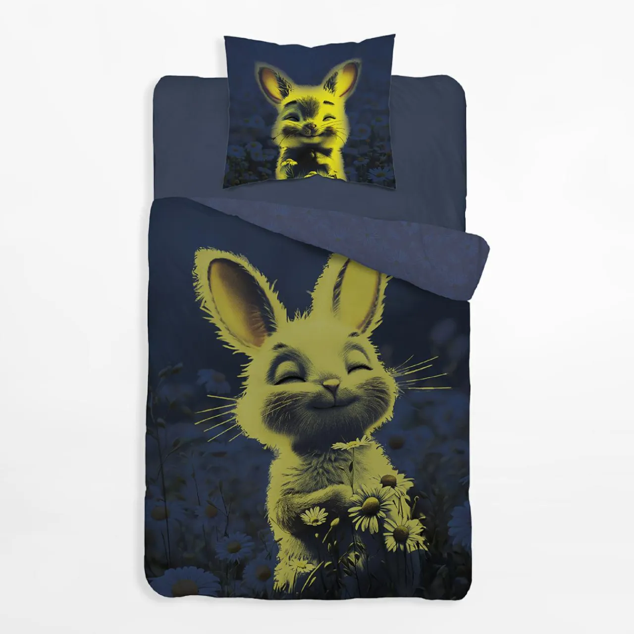 - W dzień kolorowa grafika będzie cieszyć oko, a po zmroku rozbłyśnie! Pościel posiada fluorescencyjny nadruk z uroczym zwierzątkiem – z puchatym królikiem przyjemniej się zaśnie.