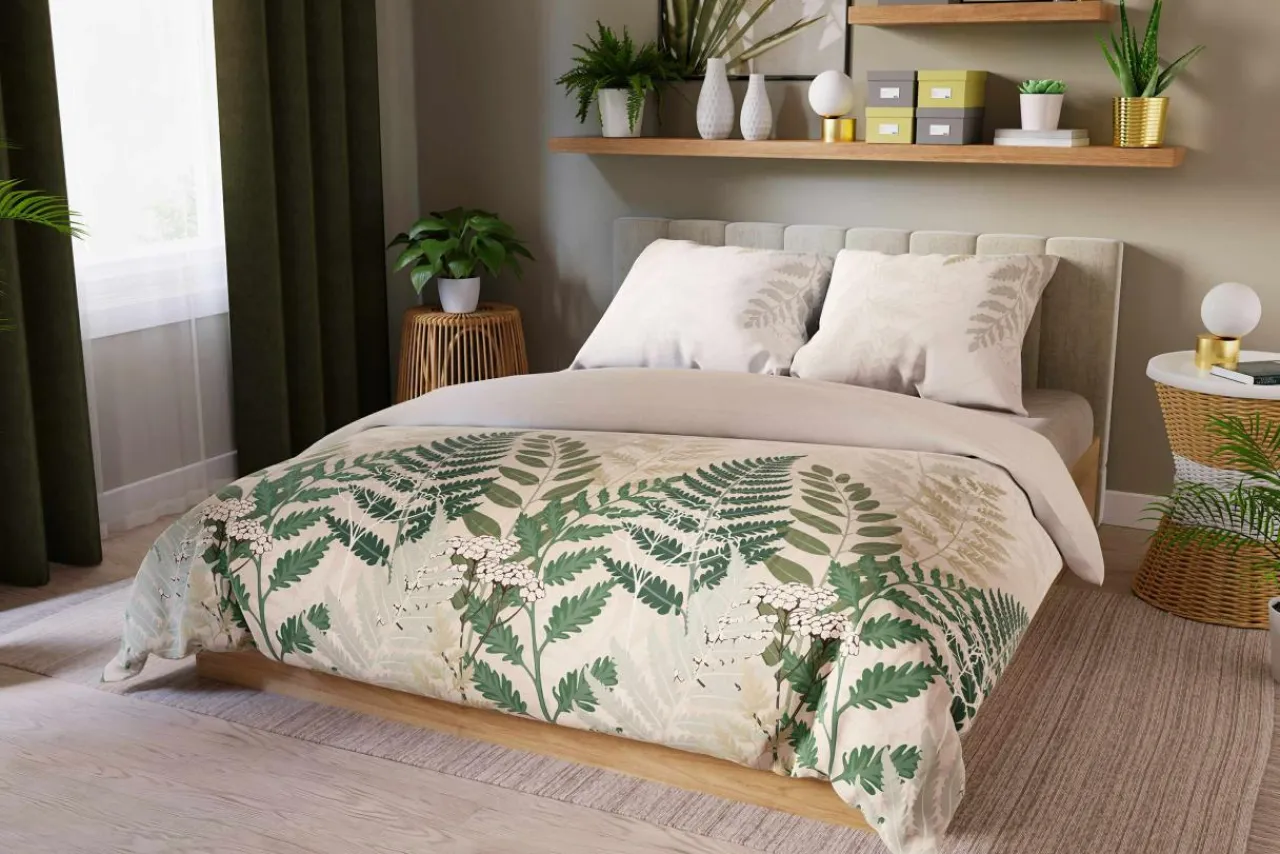 Dzięki pościeli z bawełny satynowej FERNA poczujesz wyciszające otulenie. Miękki i przewiewny materiał zadziała kojąco przed snem.