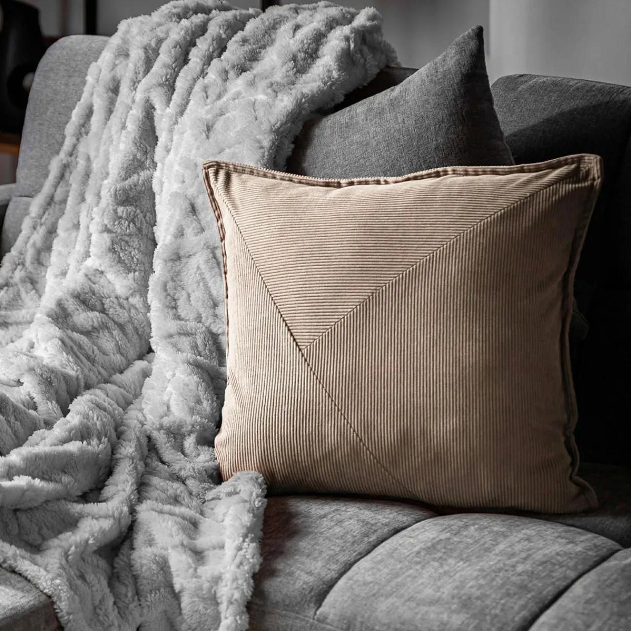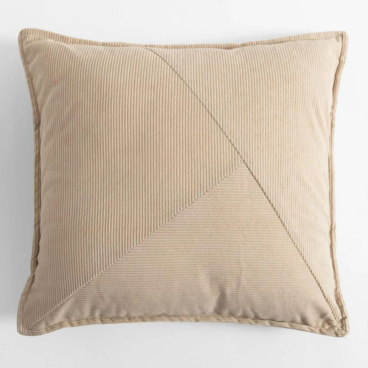 Beżowa poszewka IRENE z miękkiego materiału pasuje do drewnianych i brązowych mebli.
