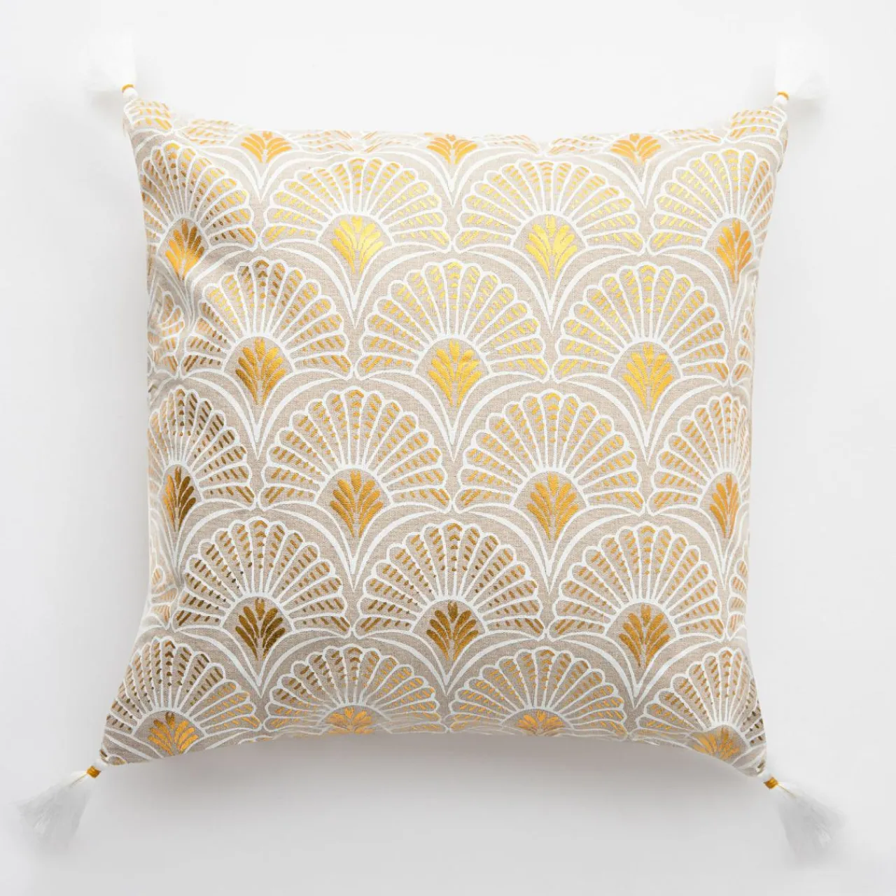 - 4 białe chwosty są zdobione złotymi nitkami – razem z połyskliwym wzorem na poszewce tworzą spójną kompozycję i ożywią wnętrze.