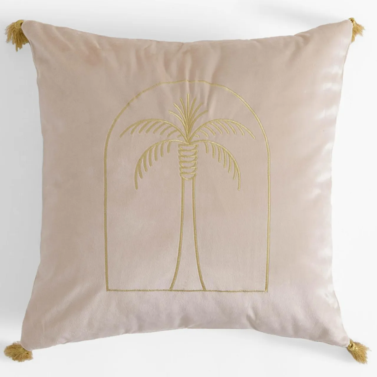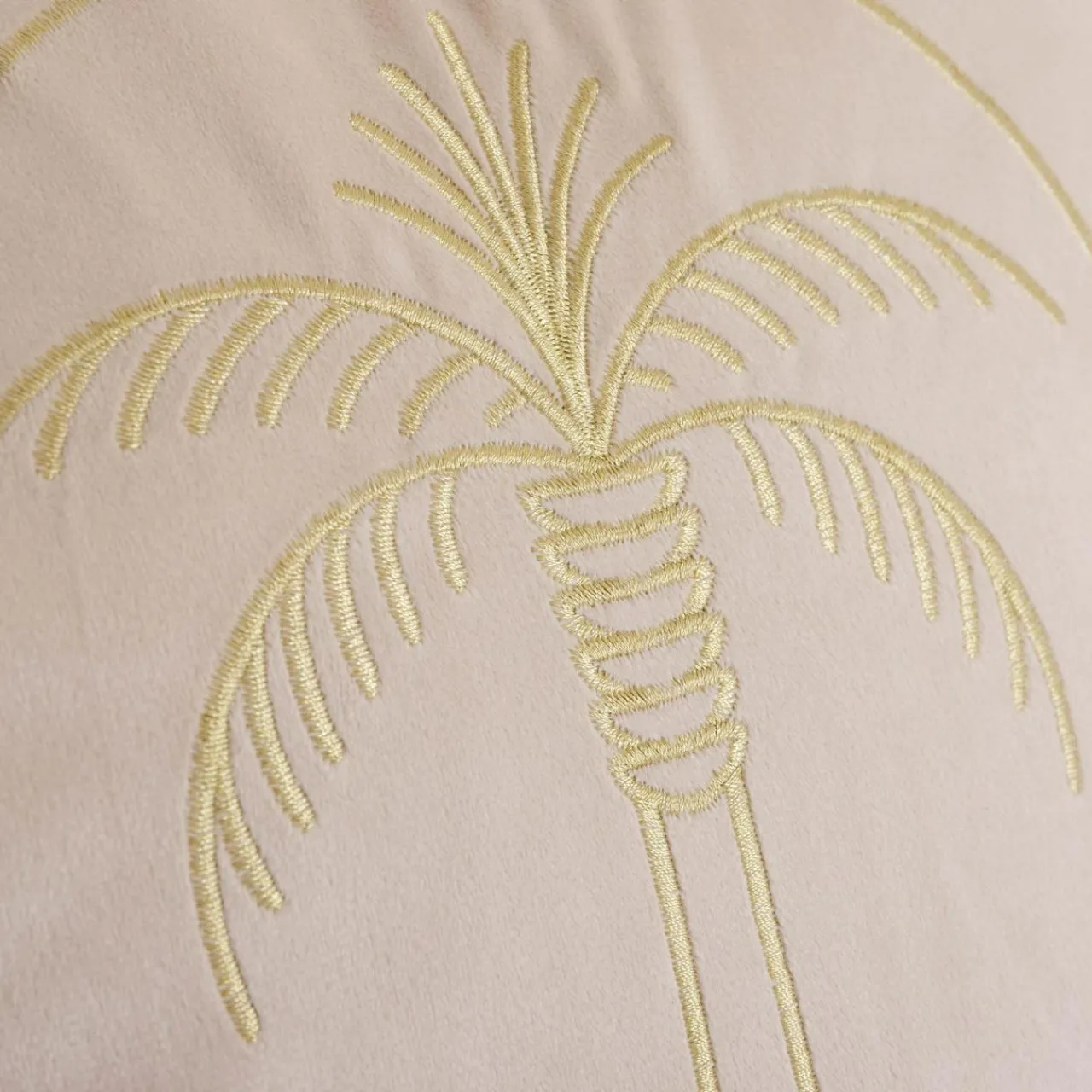 Welurowa poszewka DJERBA ze wzorem złotej palmy podkreśli egzotyczną aranżację.