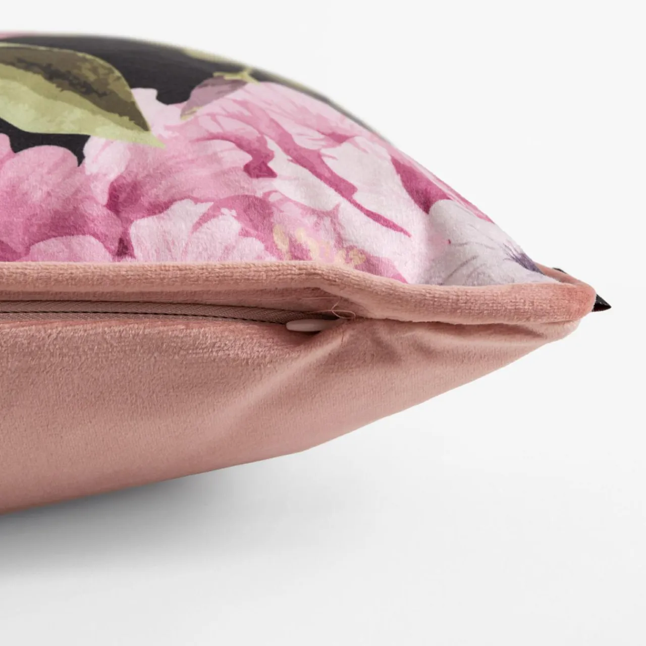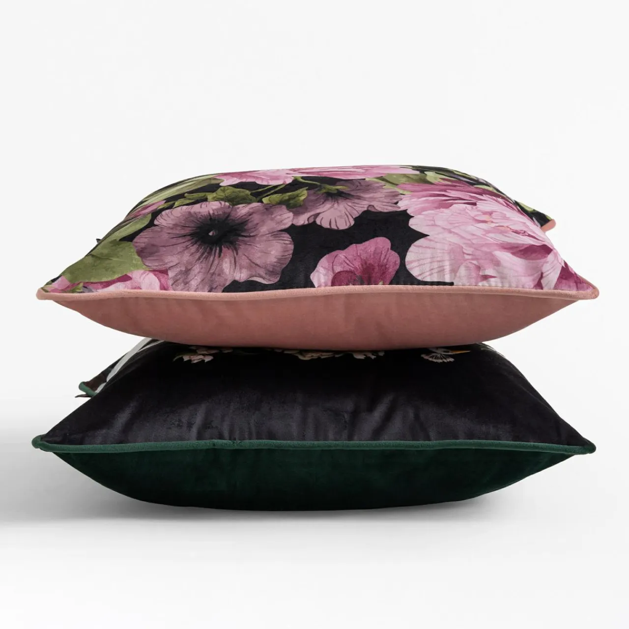 Dekoracyjna poszewka COLINA o czarno-różowym kolorze z roślinnym motywem róż i petunii podkreśli wnętrze w stylu romantycznym.